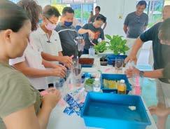 Peserta kursus menjalankan latihan amali teknik asas gubahan jambangan bunga.