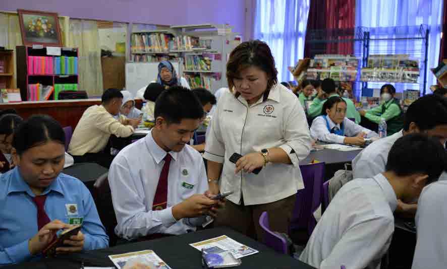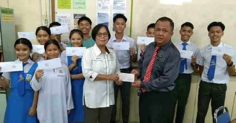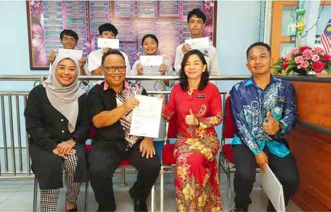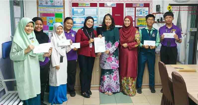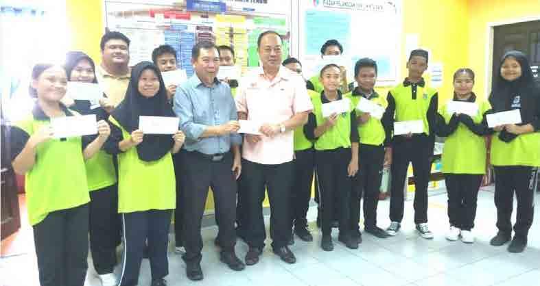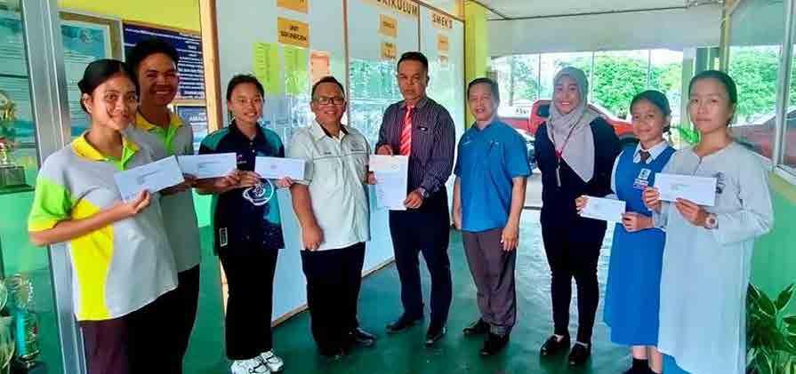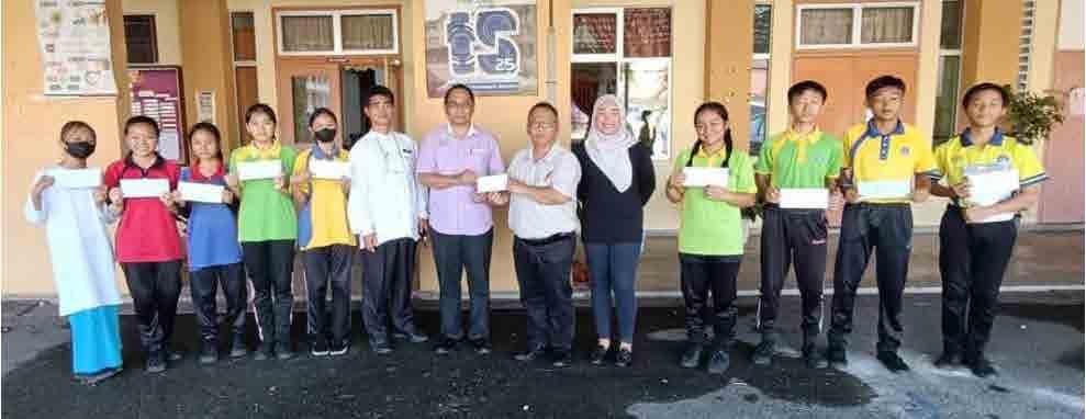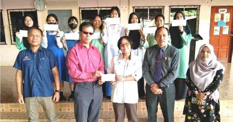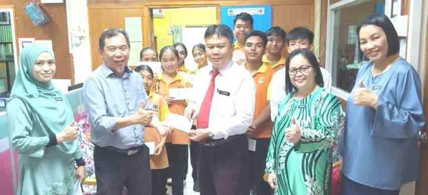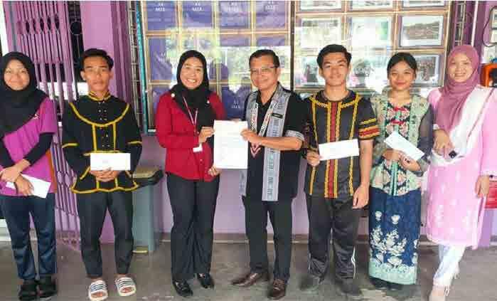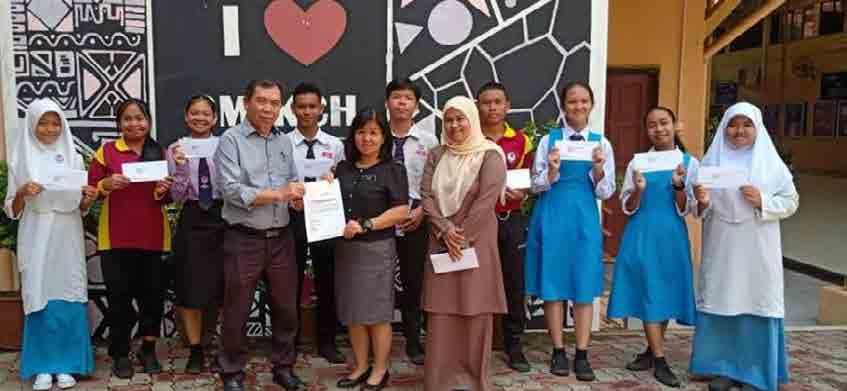 Pengetua SM St. Martin Tambunan, Encik Pancratius Primus (depan, kanan) menerima cek BMYS yang disampaikan oleh Puan Justina David (empat dari kiri) dan para penerima BMYS.