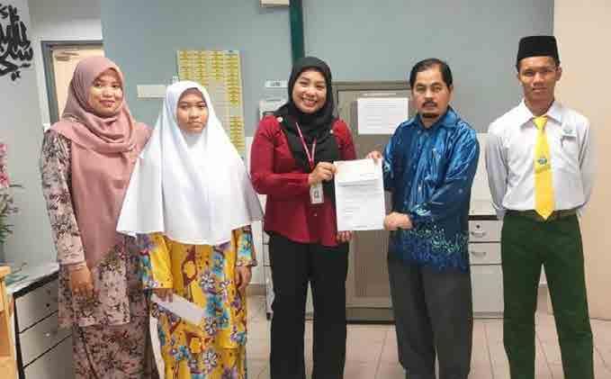 Penolong Kanan Hal Ehwal Murid SMK Tambunan, Tambunan, Puan Kittih Ombou (tengah) menerima cek BMYS daripada Puan Justina David (kanan) dan disaksikan oleh Guru Biasiswa, Puan Mackrina Yubong (kiri).