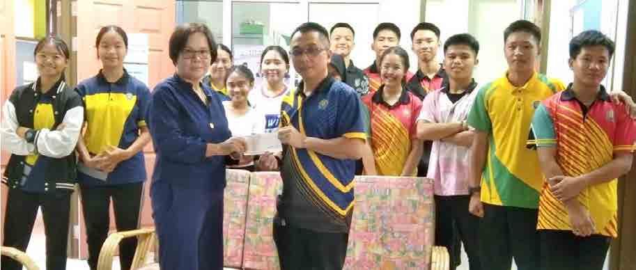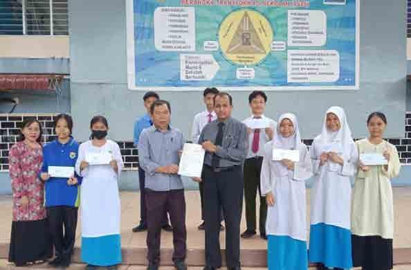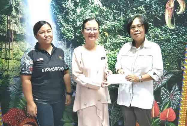 Puan Justina David (depan, kiri) menyampaian cek BMYS kepada Penolong Kanan Hal Ehwal Murid SMK Nambayan, Encik Bede John.