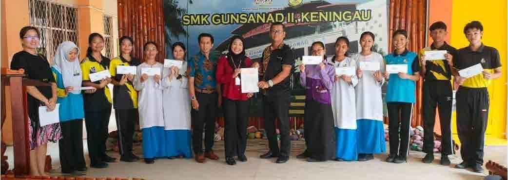 Penyampaian cek BMYS daripada Encik Suwandy Sundu (depan, dua dari kanan) kepada Pengetua SMK Nabawan 2, Encik Salimun@Ambuor Amaron (depan, dua dari kiri). Turut serta adalah Penolong Kanan Hal Ehwal Murid, Encik Petrus Andrew Rupin (kiri), Guru Penyelaras Biasiswa, Puan Norhidayah (kanan) dan para penerima BMYS.