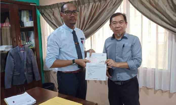 Penyampaian cek BMYS kepada Pengetua SMK Entabuan,Tenom, Encik Azalan Dimon (kiri) daripada Encik Hamidin Suin.