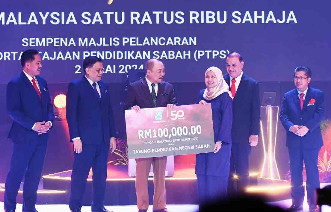 Pengurus Besar Petroliam Nasional Berhad (Petronas) Wilayah Sabah/Labuan, Puan Siti Ayu Haniza binti Abdul Wahab menyerahkan sumbangan sebanyak RM100,000.00.