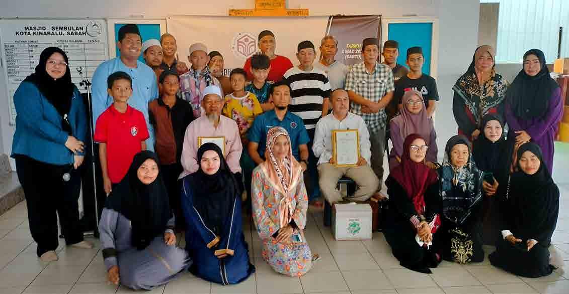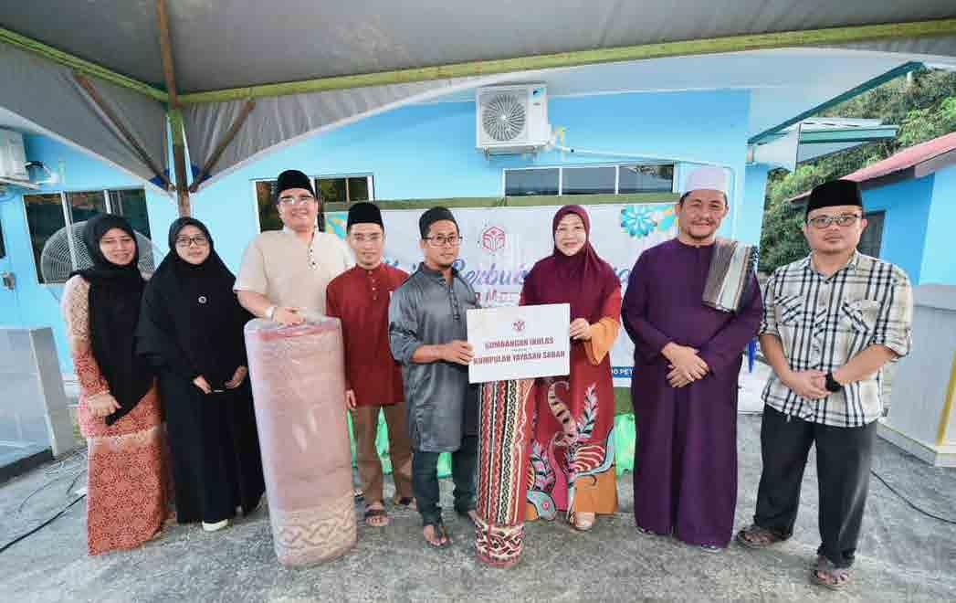 Encik Zulkhairi (tiga dari kiri) menyerahkan sumbangan berupa empat gulung sejadah kepada Pengerusi Masjid Kampung Kuala, Papar.