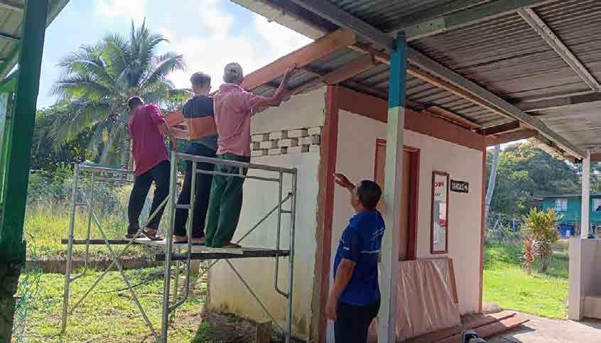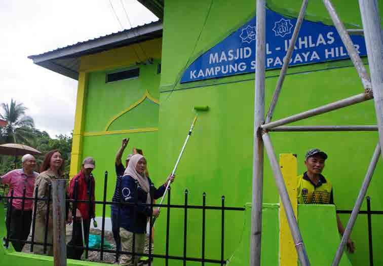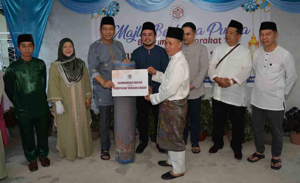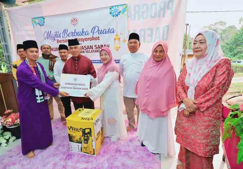 Puan Siti Sheriffah (empat dari kanan) turut menyampaikan sumbangan untuk tabung surau dan peralatan kepada Pengerusi Surau Kg. Sg. Bubus, Sipitang, Imam Roslan bin Bakal (kiri), sambil disaksikan oleh ADUN Sindumin, Datuk Dr. Yusof bin Yacob (lima dari kanan).