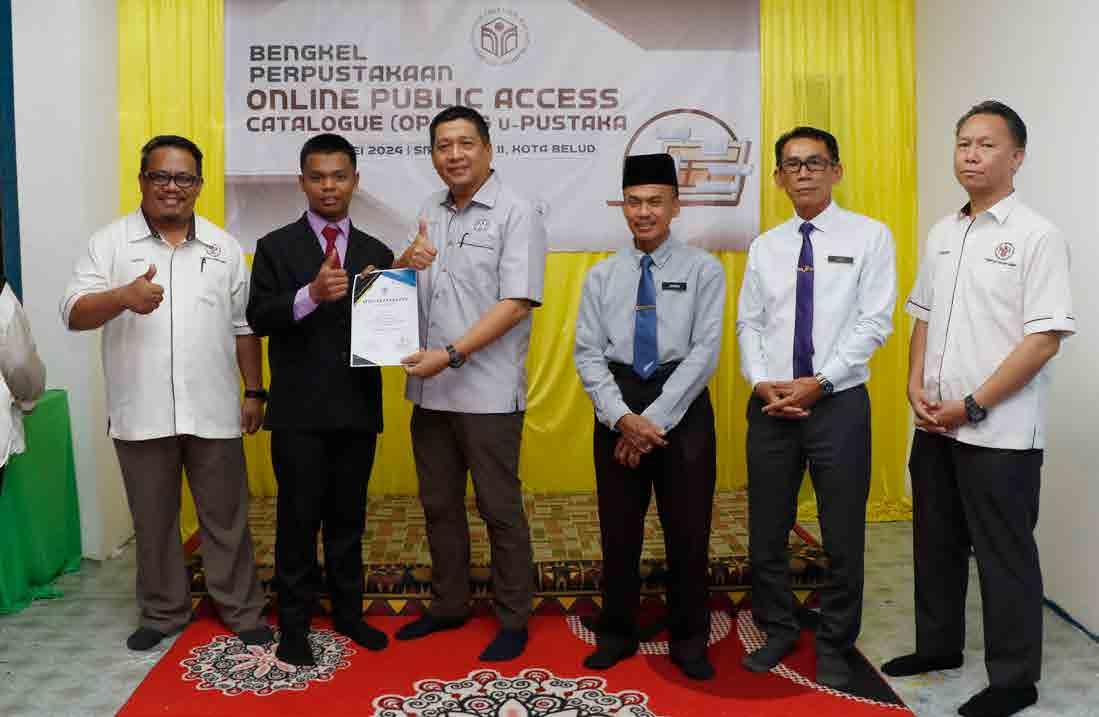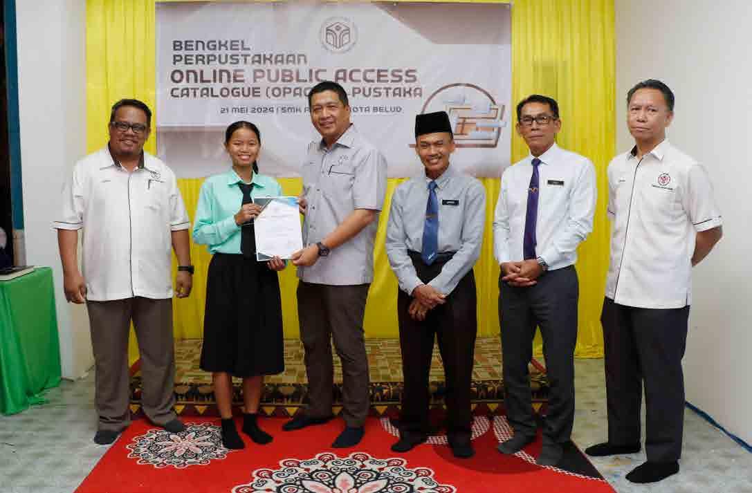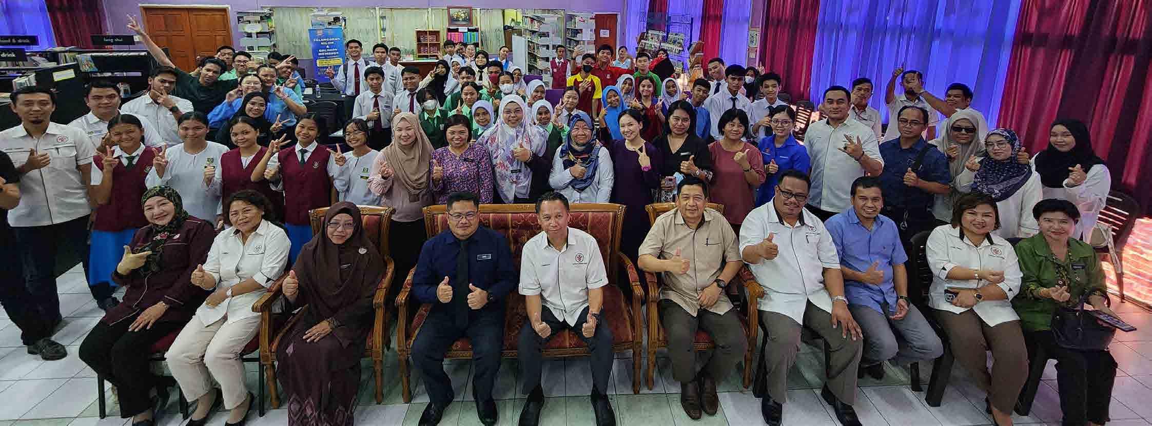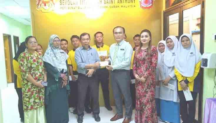 Encik Hamidin Suin (tiga dari kiri) menyampaikan cek BMYS kepada Pengetua SMK St. Anthony, Tenom, Encik Gilbert S. Olas (lima dari kanan).