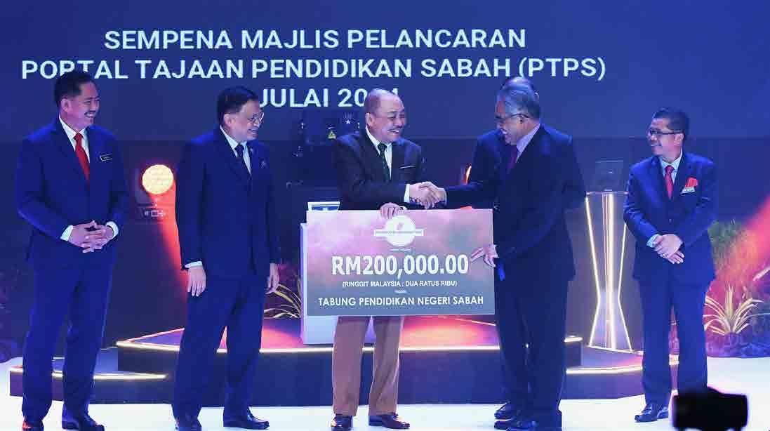 Pengerusi Progressive Insurance Berhad Tan Sri Datuk Seri Panglima Sukarti Bin Wakiman menyampaikan sumbangan sebanyak RM200,000.00. Sumbangan daripada Perbadanan Pinjaman Sabah sebanyak RM250,000.00 disampaikan oleh Pengerusinya, Datuk Sri Panglima Dr. Yee Moh Cai.