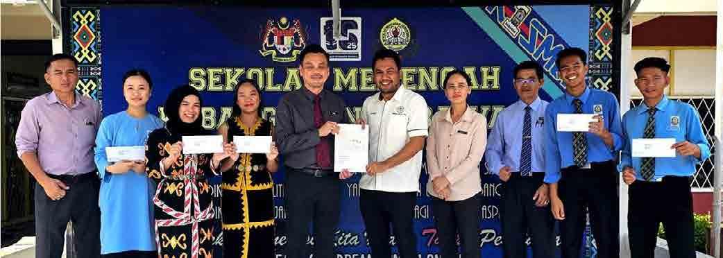 Pengetua SMK Nabawan, Encik Goh Soon Peng (lima dari kiri) menerima cek BMYS daripada Encik Suwandy Sundu (lima dari kanan) dan disaksikan oleh Guru Biasiswa, Encik Julian Mikat (kiri)