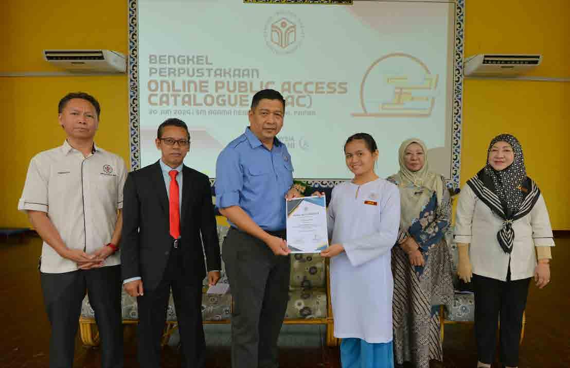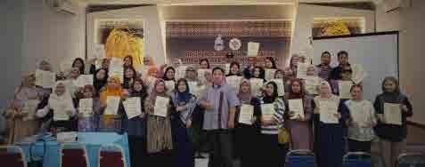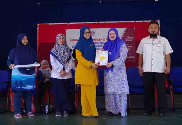 Puan Siti Sharifah (tiga, kiri) menyampaikan sijil kepada Puan Farella.