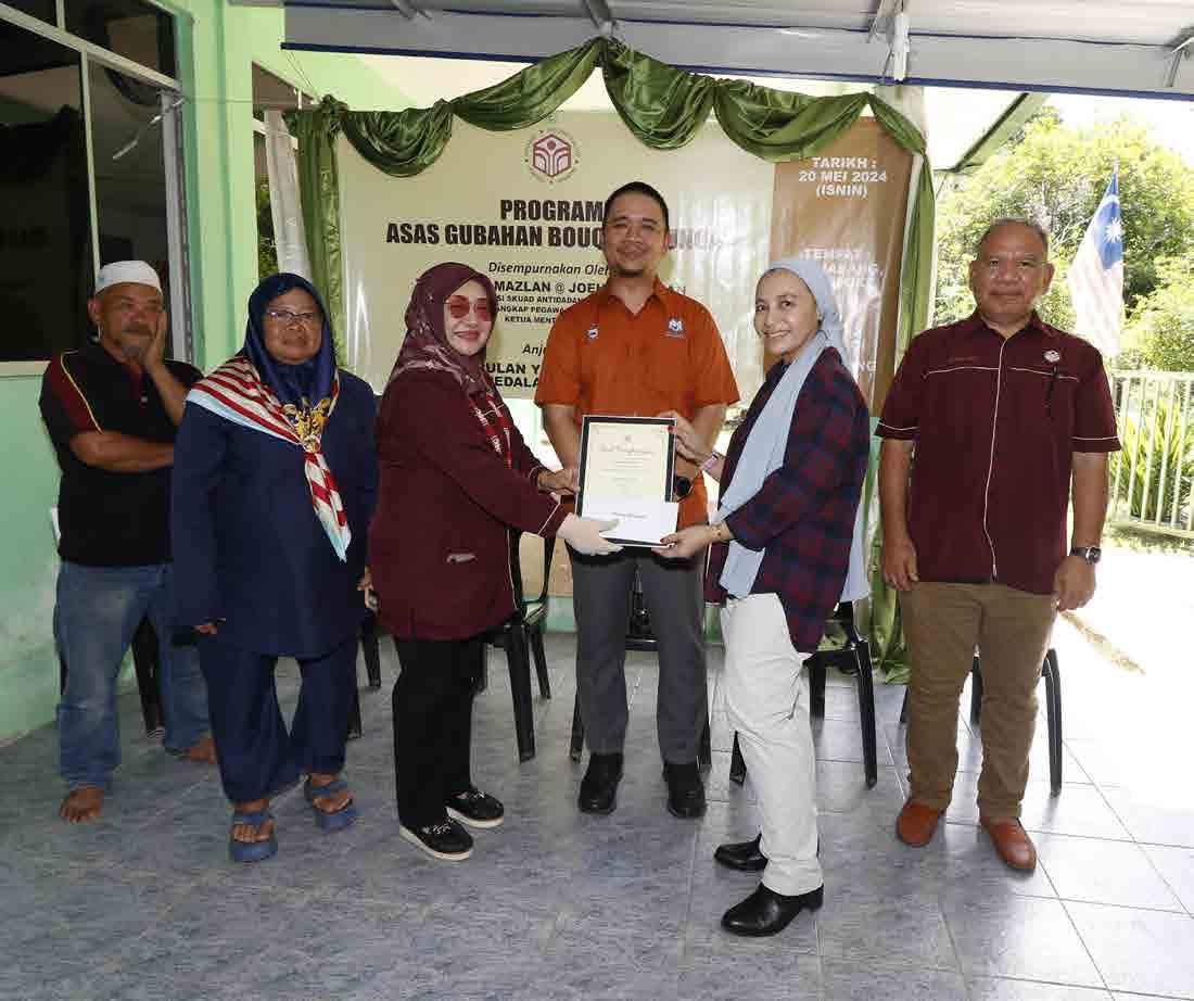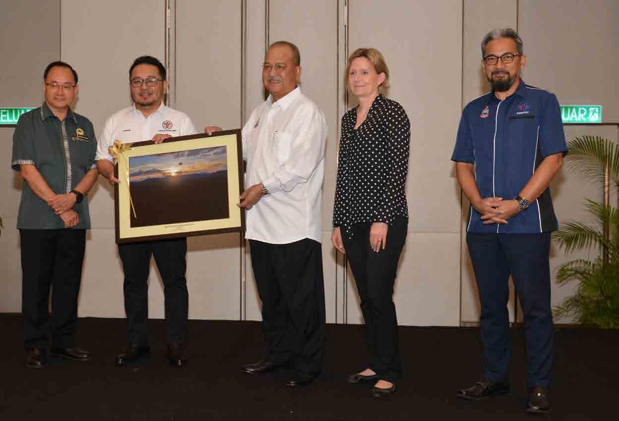 Puan Siti Sharifah (tiga, kiri) menyampaikan cenderamata kepada Tuan Haji Mazlan @ Joehari Manan.