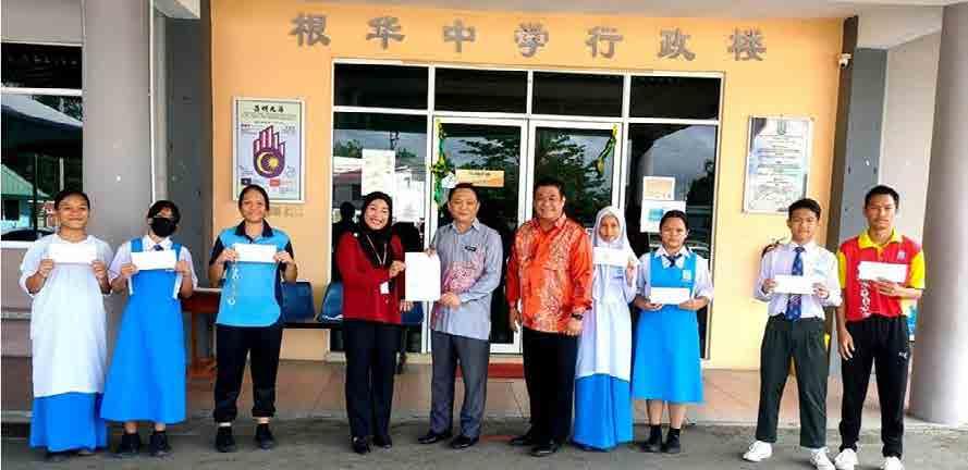 Penyampaian cek BMYS kepada Pengetua SMJK Chung Hwa, Tenom, Puan Ouu Chu Suan (lima dari kanan) oleh Encik Hamidin Suin (empat dari kiri).