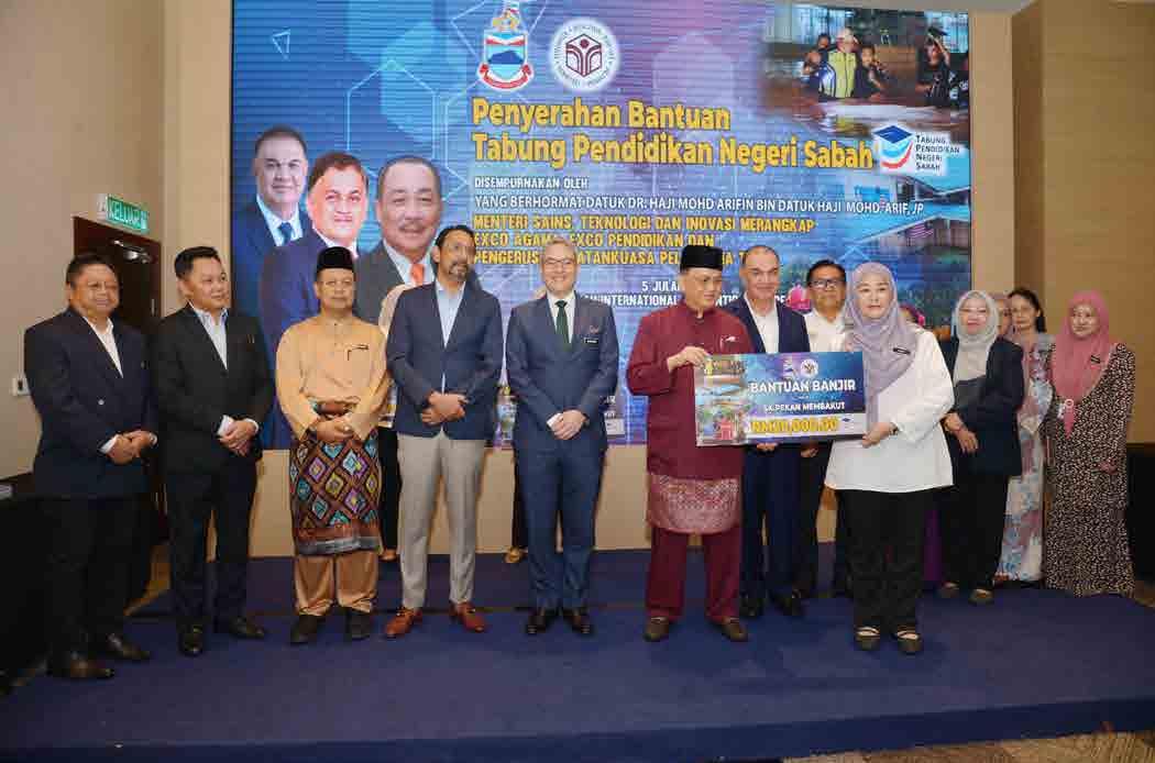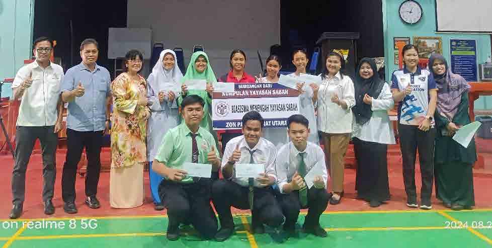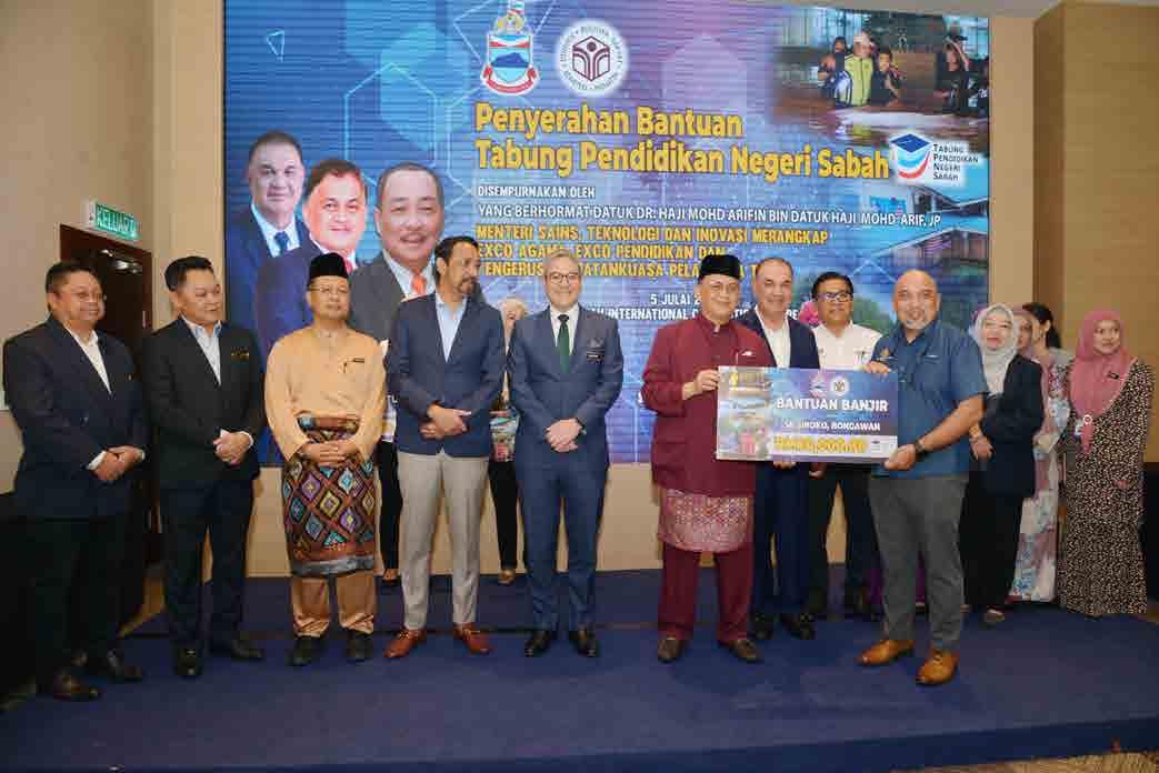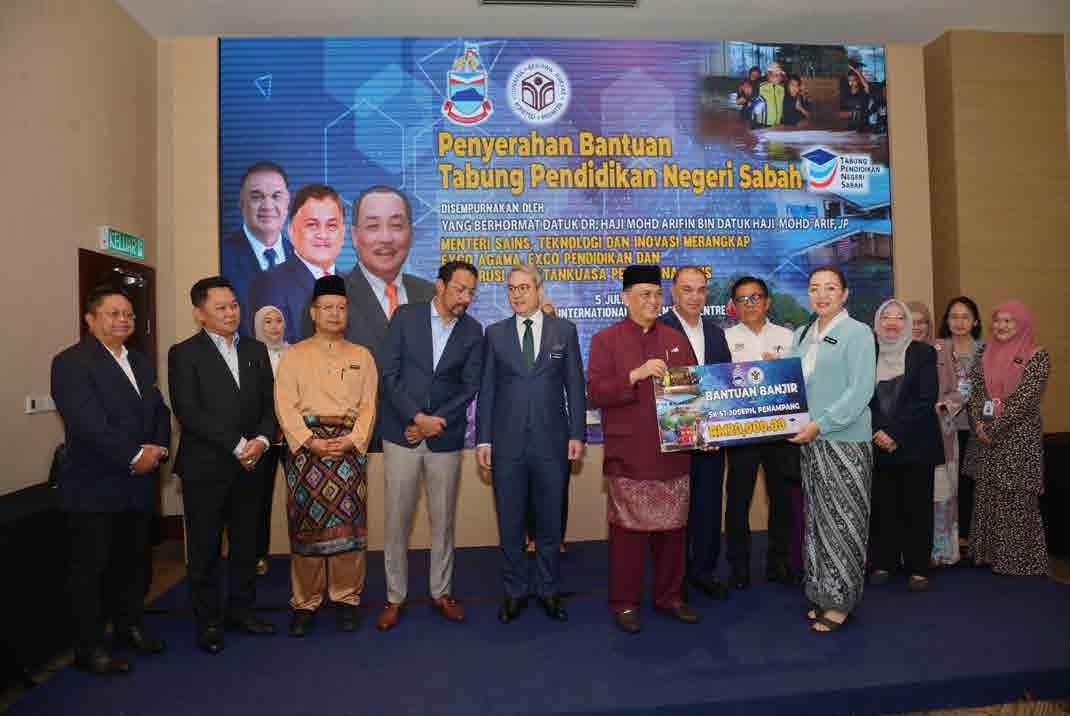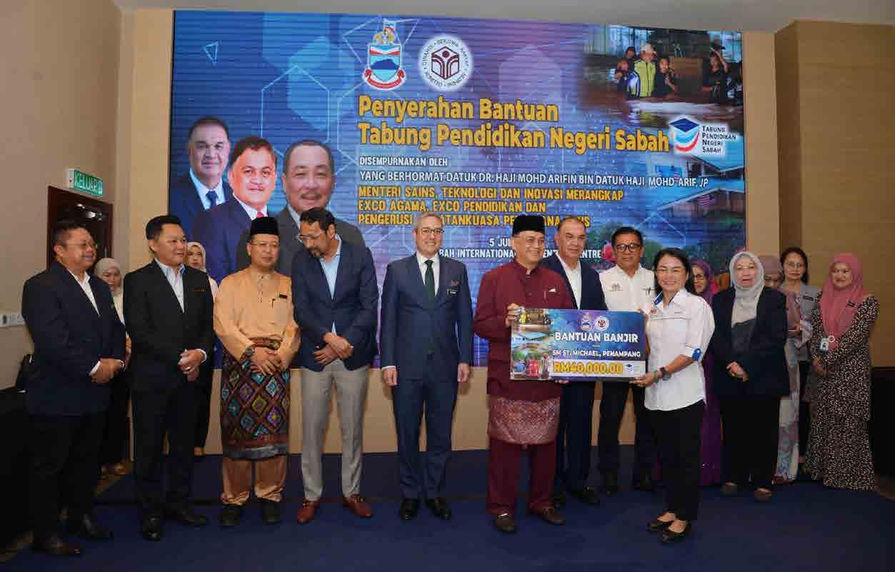 Datuk Dr. Haji Mohd. Arifin (enam, kiri), disaksikan oleh Dato’ Sri Haji Gulamhaidar (tujuh, kiri) dan Datuk Brenndon (lima, kiri) menyampaikan cek replika bantuan kepada wakil SK St. Joseph Penampang.