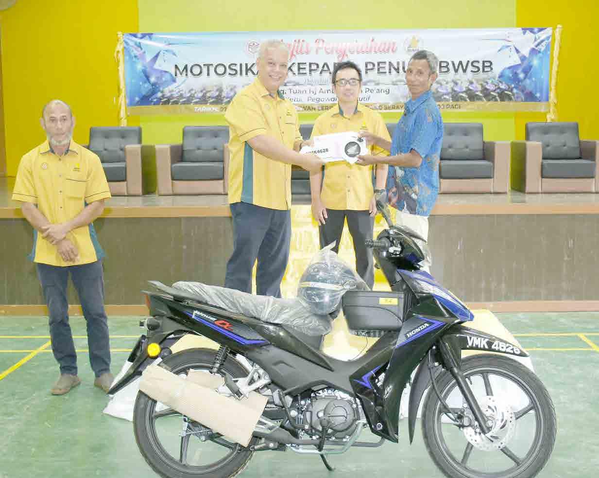 Encik Jessel menyampaikan Anugerah Pelajar Cemerlang SPM kepada adik Joyce Jimmy Giddah. Turut serta Encik Gerard C. Mojiliu, Anggota Lembaga KPYSB (kiri) dan juga Puan Jessie Toiloh (kanan).