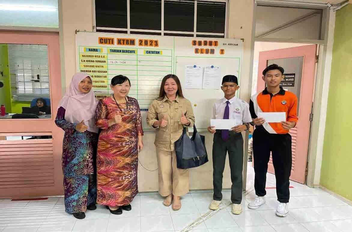 Wakil SM St. Michael menerima cek replika bantuan banjir bernilai RM40,000 daripada