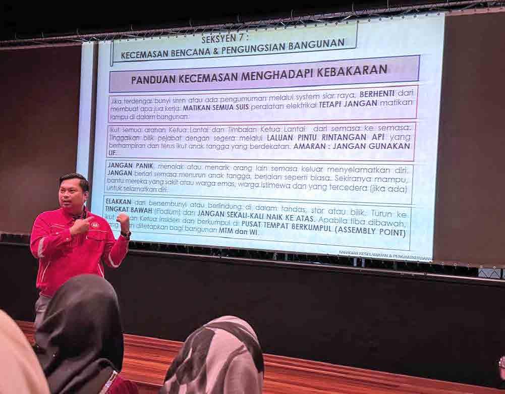 A talk titled “Evacuation And Fire Safety” took place on 26 September 2024 was attended by 85 Yayasan Sabah Group staff. The talk was delivered by Assistant Fire Chief, Security and Fire Department JBPM Sabah, Mohiddin Bin Abdul Majid, talked on workplace evacuation and fire safety, covering the definition, objectives, the purpose of the exercise, evacuation methods, and their execution. He also explained how to identify emergency exit doors and provided safety measures for handling emergencies like earthquakes, wildfire or blackouts.