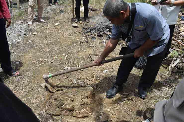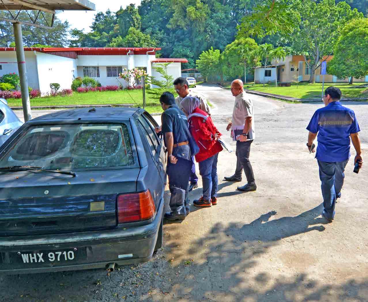Pegawai Penyelenggaraan Bahagian Tenaga & Fasiliti, Encik Mahat bin Abdul Rahman (kiri), Encik Midin (tengah), Puan Moneerah (berjaket merah) dan Encik Gerard (dua dari kanan) memeriksa kenderaan terbiar yang diletakkan bukan di kawasan parkir.