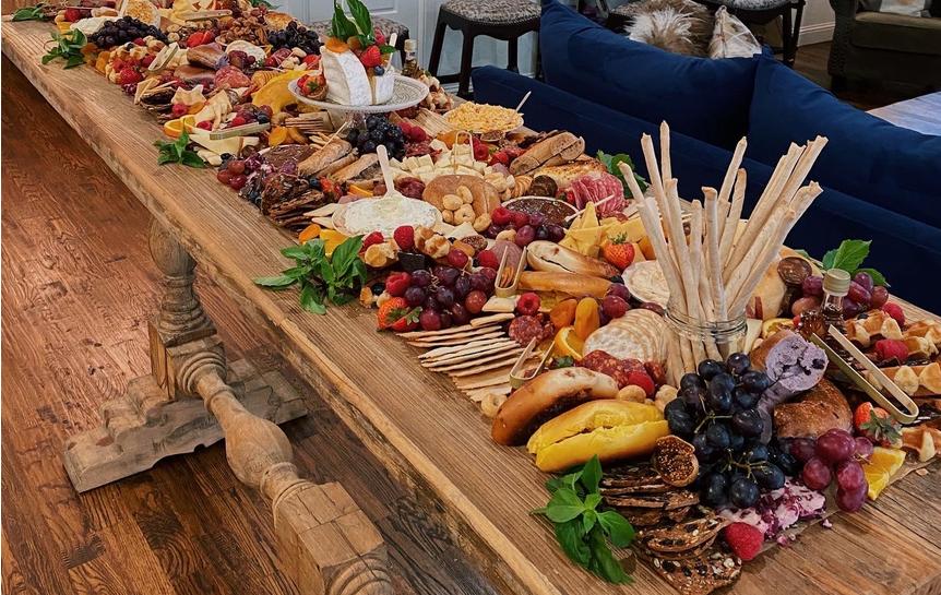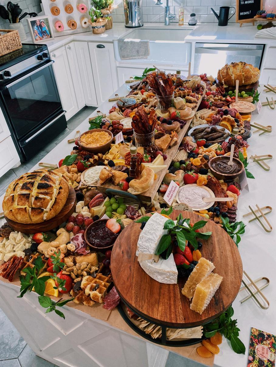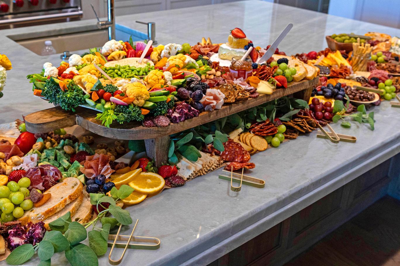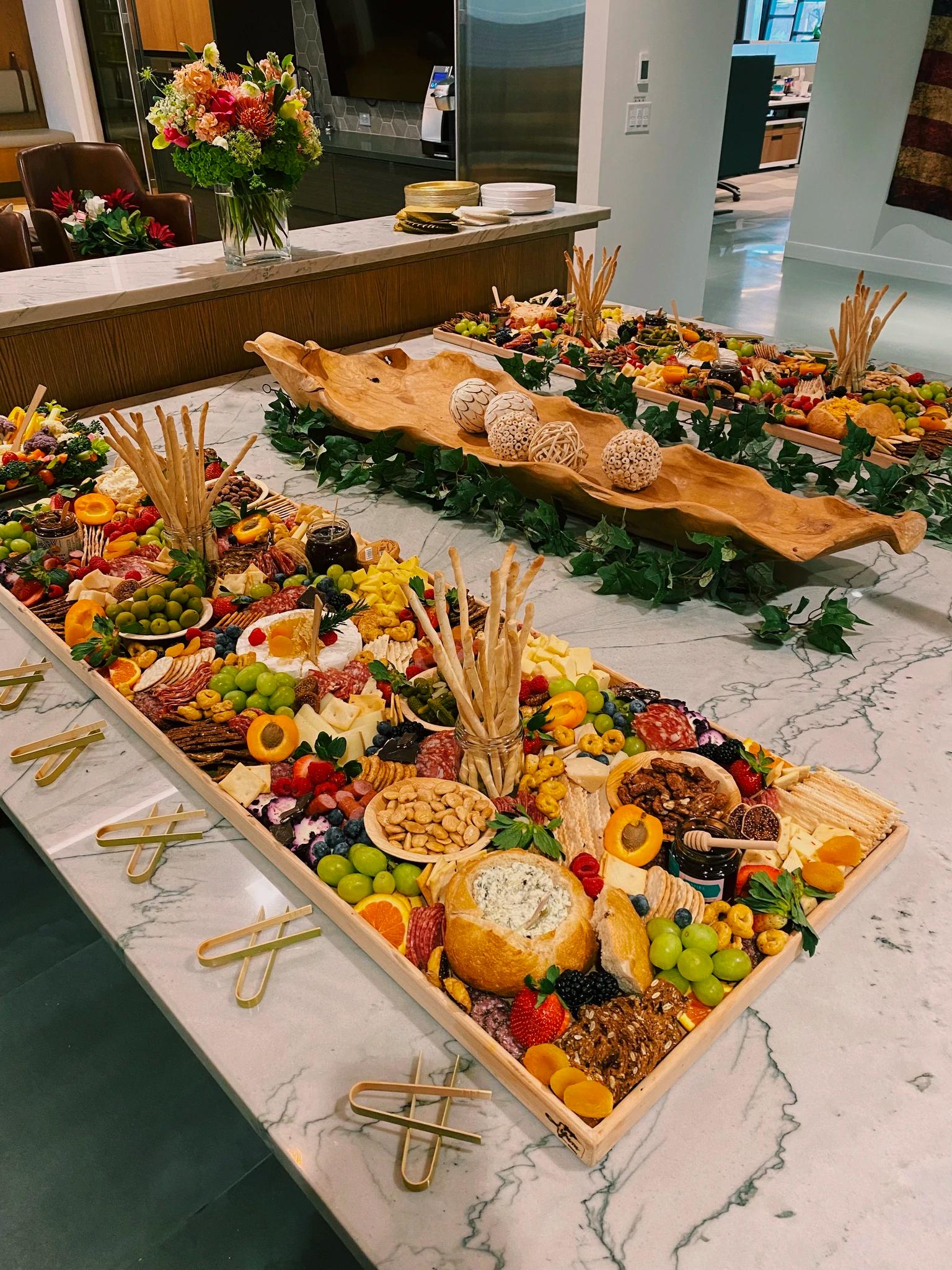 6-10 different crowd favorite cheeses (we stay away from blue cheese / anything stinky unless requested), 2-3 different dips, charcuterie, jams, honey, fresh honeycomb, artisan crackers and fresh bread, seasonal produce, dried fruit, cornichons, olives, dark chocolate, nuts, and so much more.