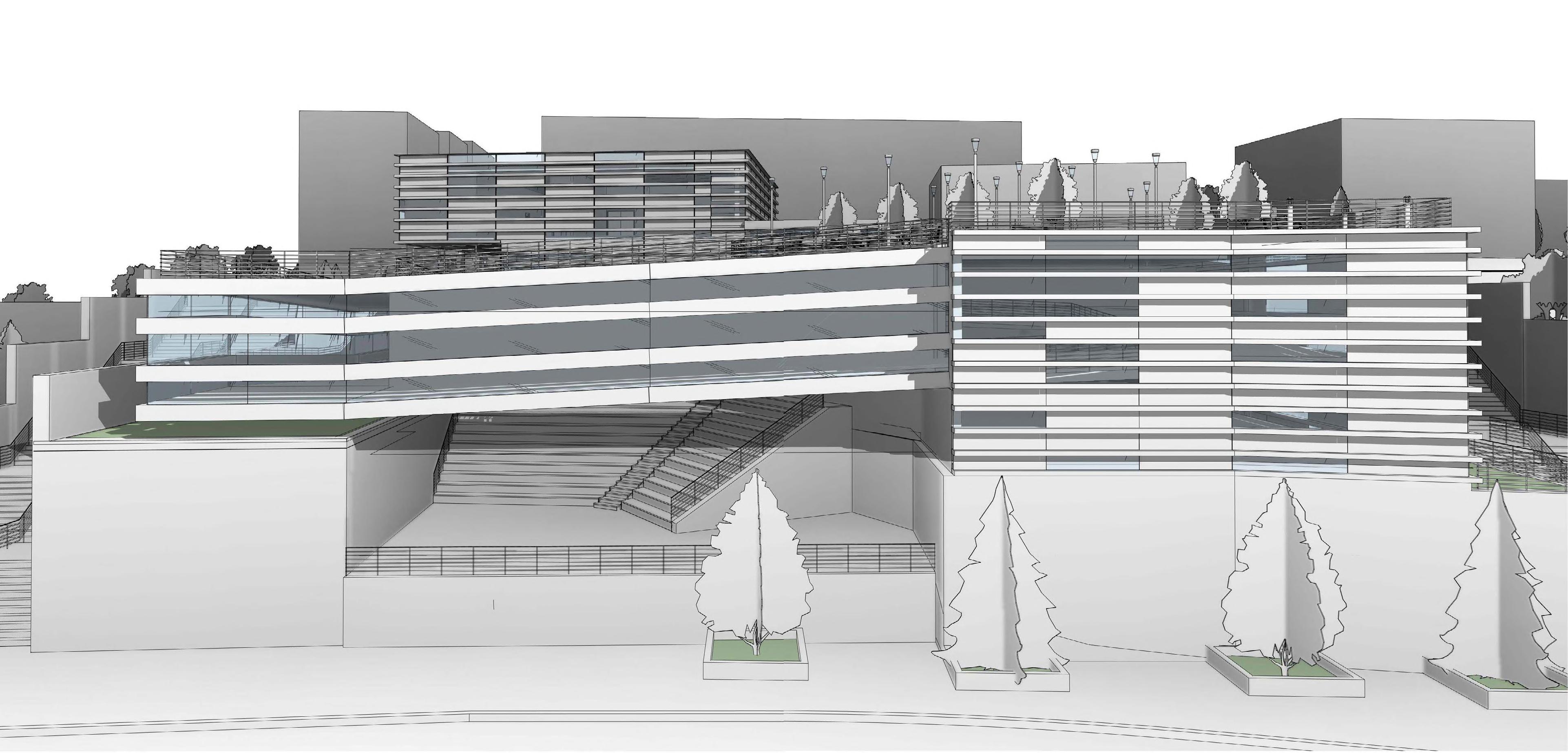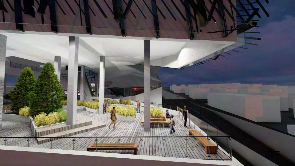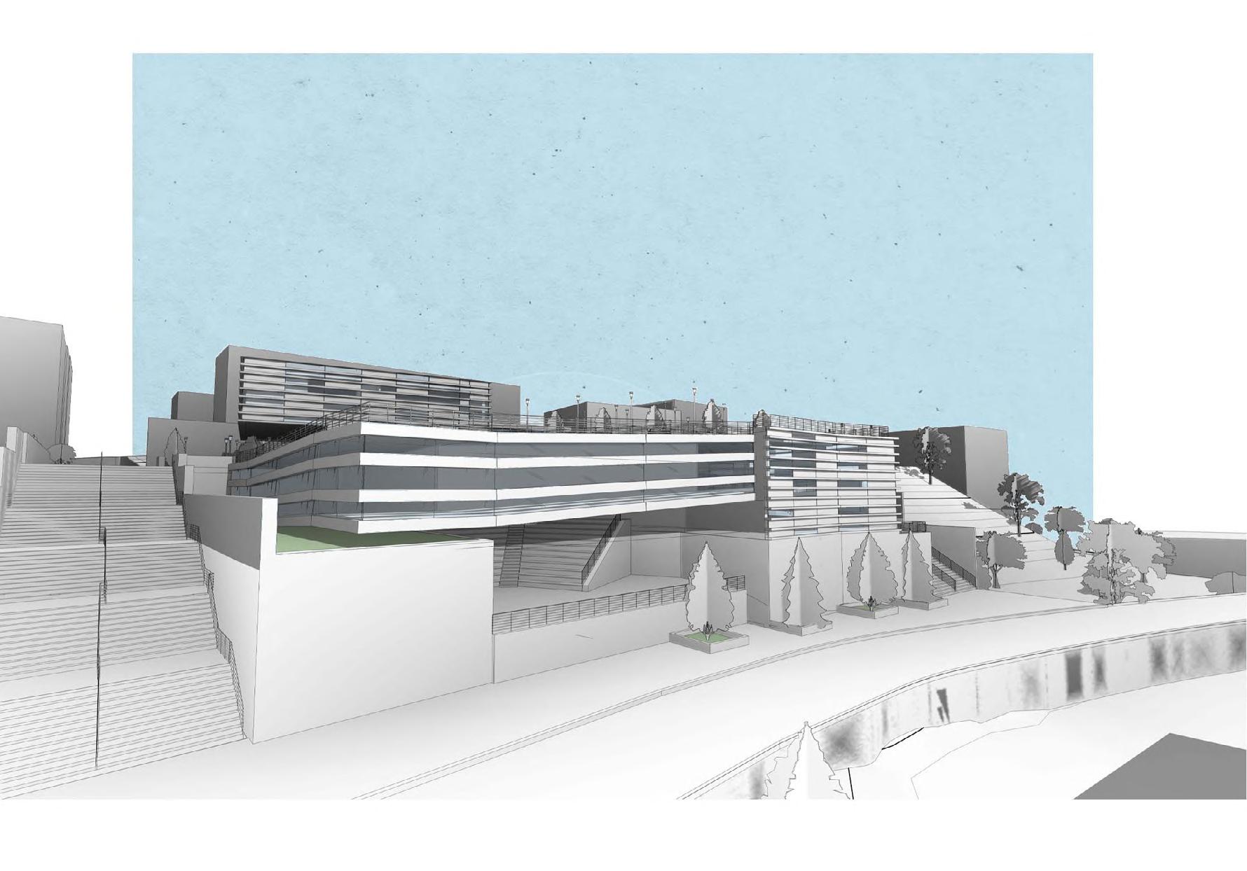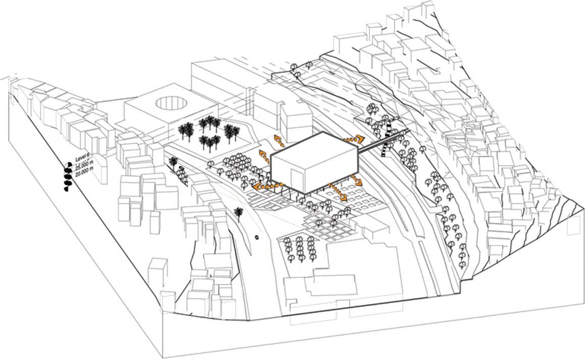 surrounding landscape, fostering a sense of unity and belonging. elevating the building to accommodate a public space. This approach arises from the need to address an existing subterranean torrent that traverses the site. Also, It serves as a catalyst for the creation of an inviting public realm, seamlessly merging the built environment with the surrounding context.Furthermore, the elevated design promotes accessibility and inclusivity.