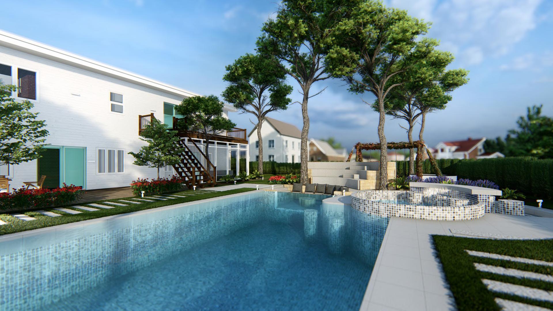 The idea behind the design is to provide the homeowners› backyard space a whole lifestyle, complete with a swimming pool, sunbeds, an outdoor gym where they can exercise, a barbecue where they can prepare lunch, and a stool where they can enjoy a drink while the kids play.