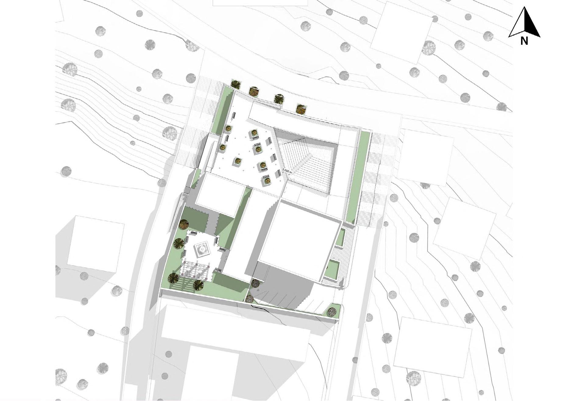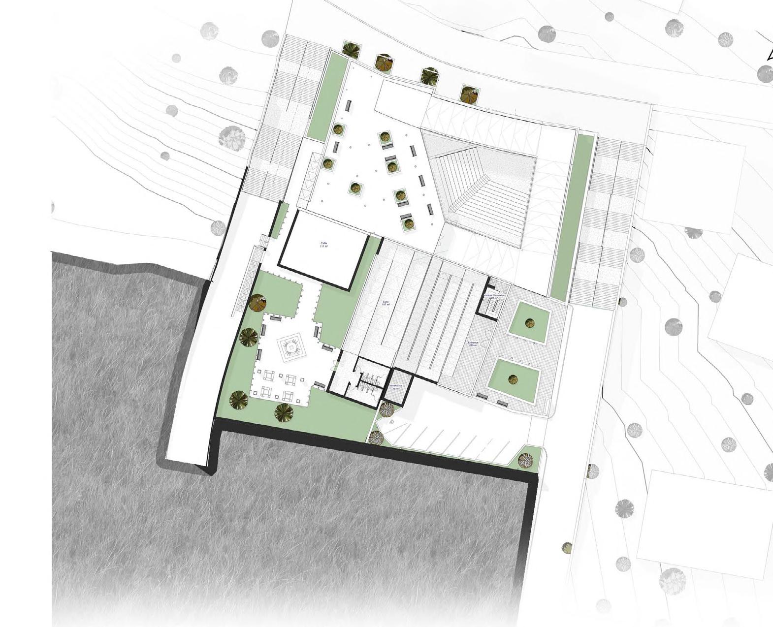 Green Roof level and the bridge that connects the mountainside and this open public space plans that represent the mountainous terrain in the surrounding built environment