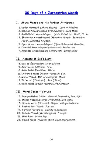 30 Days of a Zoroastrian Month I. Ahura Mazda and His Perfect Attributes Dādār Hormazd (Ahura Mazda): Lord of Wisdom. Bahman Amaeshāspand (Vohū Manoh): Good Mind. Ardibēhēsht Amaeshāspand (Asha Vahishta): Truth, Order. Shehrevar Amaeshāspand (Kshathra Vairya): Benevolent Power, Desirable Kingdom. 5. Spendārmard Amaeshāspand (Spentā Ārmaiti): Devotion. 6. Khordād Amaeshāspand (Haurvatat): Perfection. 7. Amardād Amaeshaspand (Ameretat): Immortality