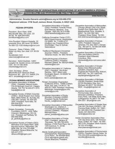 FEDERATION OF ZOROASTRIAN ASSOCIATIONS OF NORTH AMERICA (FEZANA) FEZANA Office: 8615 Meadowbrook Dr., Burr Ridge, Il 60527 www.fezana.org Administrator: Zenobia Damania admin@fezana.org tel 630-468-2705 Registered address: 5750 South Jackson Street, Hinsdale, IL 60521 USA FEZANA OFFICERS President:, Bomi Patel, 4296 Mountcastle Way, San Jose, CA 95136, Tel: 408-264-4395, bomifezana@yahoo.com Vice-President: Katayun Kapadia, 33, preamble Drive, Mt Laurel, NJ 08054, Tel 856-722-1030 kkatayun@msn.com Treasurer: Ratan P Mistry, 1258, Water Lily Way, San Jose, CA 95129 USA Tel:408-642-1201. ratanmistry@hotmail.com Secretary: Nahid Dashtaki, 12851 Longden St, Garden Grove, CA 92845 USA. Tel 714 390-4838. ndashtaki@gmail.com, Asst. Secretary: Shiraz Mavalvalla,8191 Bowcock Road, Richmond, BC. V6Y 1C1 Tel604 2744973 shizaitalia@hotmail.com FEZANA MEMBER ASSOCIATIONS Zoroastrian Association of Alberta, (ZAA): President: Neelum Austin, 316-30 McHugh Court N.E. Calgary, Alberta. T2E 7X3 Tel 403-271-1273, bapaiji@telus.net Zoroastrian Society of British Columbia (ZSBC): Arbab Rustam Guiv Darbe Mehr, 8900 Halifax St., Burnaby, BC V5B 2R5, Canada, Tel: 604-4203500, President: Homi Italia, Tel: 604-438-2076 Homiitalia@hotmail.com Ontario Zoroastrian Community Foundation (OZCF): 4244 Taffey Crescent, Mississauga, ON L5L 2J2, President Jal Panthaky Tel: 905-568-4946, jal_panthaky@yahoo.ca Zoroastrian Society of Ontario (ZSO): Mehraban Guiv Darbe Mehr, 3590 Bayview Avenue, Willowdale, ON M2M 3S6, Tel: 416-733-4586, President: Daraius Bharucha, Tel: 905-427-3177, dbharuc593@rogers.com