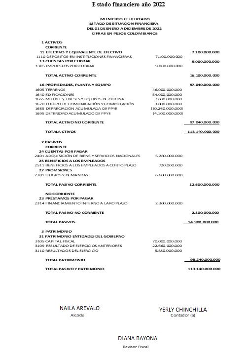 CÓDIGO CONCEPTO DEBE HABER SALDO 2022 SALDO 2023 NUEVO SALDO 1110 DEPOSITO EN INSTITUCIONES FINANCIERAS 7.100.000.000 7.100.000.000 29.405.776.633 36.505.776.633 1305 IMPUESTOS POR COBRAR 9.000.000.000 9.000.000.000 9.000.000.000 1605 TERRENOS 46.000.000.000 46.000.000.000 46.000.000.000 1636 PROP. PLANTA Y EQPO. EN MANTENIMIENTO - 4.172.521.008 4.172.521.008 1640 EDIFICACIONES 54.000.000.000 54.000.000.000 11.921.000.000 65.921.000.000 1655 MAQUINARIA Y EQUIPO - 825.600.000 825.600.000 1665 MUEBLES, ENSERES Y EQUIPOS DE OFICINA 7.600.000.000 7.600.000.000 800.000.000 8.400.000.000 1670 EQUIPOS DE COMUNICACIÓN Y COMPUTACIÓN 3.800.000.000 3.800.000.000 3.800.000.000 1685 DEPRECIACIÓN ACUMULADA DE PPYE (10.260.000.000) (10.260.000.000) (10.260.000.000) 1695 DETERIORO ACUMULADO PPYE (4.100.000.000) (4.100.000.000) (4.100.000.000) 1705 BIENES DE USO PÚBLICO EN CONSTRUCCIÓN - 8.403.361.345 8.403.361.345 2314 CRÉDITOS A LARGO PLAZO 2.300.000.000 2.300.000.000 10.000.000.000 12.300.000.000 2401 ADQUISICIÓN DE BIENES Y SERVICIOS 5.280.000.000 5.280.000.000 6.756.650.000 12.036.650.000 2403 TRANSFERENCIAS POR PAGAR - 66.553.158 66.553.158 2407 RECURSOS A FAVOR DE TERCEROS - 2.758.807.482 2.758.807.482 2410 RECURSOS DESTINADOS AL SISTEMA DE SALUD - 5.536.000.000 5.536.000.000 2436 RETENCIÓN EN LA FUENTE - 1.216.461.993 1.216.461.993 2440 IMPUESTOS, CONTRIBUCIONES Y TASAS - 387.359.000 387.359.000 2445 IVA POR PAGAR - (2.694.113.782) (2.694.113.782) 2490 OTRAS CUENTAS POR PAGAR - 704.000.000 704.000.000 2511 BENEFICIOS A LOS EMPLEADOS A CORTO PLAZO 720.000.000 720.000.000 219.166.667 939.166.667 2701 LITIGIOS Y DEMANDAS 6.600.000.000 6.600.000.000 6.600.000.000 3105 CAPITAL FISCAL 70.000.000.000 70.000.000.000 70.000.000.000 3109 RESULTADO DE EJERCICIOS ANTERIORES 22.660.000.000 22.660.000.000 22.660.000.000 3110 RESULTADOS DEL EJERCICIO 5.580.000.000 5.580.000.000 5.580.000.000 4105 INGRESOS POR IMPUESTOS - 13.125.460.000 13.125.460.000 4110 CONTRIBUCIONES, TASAS E ING. NO TRIBUTARIOS - 2.413.400.000 2.413.400.000 4408 TRANSFERENCIAS - 29.058.000.000 29.058.000.000 4413 SISTEMA GENERAL DE REGALÍAS - 4.800.000.000 4.800.000.000 4428 OTRAS TRANSFERENCIAS - 12.153.600.000 12.153.600.000 4705 RECURSOS DE COOFINANCIACIÓN 6.000.000.000 6.000.000.000 4802 INGRESOS FINANCIEROS - 100.000.000 100.000.000 4808 OTROS INGRESOS 1.634.000.000 1.634.000.000 5101 SUELDOS Y SALARIOS - 2.679.400.000 2.679.400.000 5102 OTRAS PRESTACIONES 40.000.000 40.000.000 5103 CONTRIBUCIONES EFECTIVAS - 888.012.100 888.012.100 5104 APORTES SOBRE LA NÓMINA - 104.000.000 104.000.000 5107 PRESTACIONES SOCIALES - 671.591.667 671.591.667 5108 GASTOS DE PERSONAL DIVERSOS - 1.800.000.000 1.800.000.000 5111 GASTOS GENERALES - 3.019.663.866 3.019.663.866 5423 OTRAS TRANSFERENCIAS - 1.824.417.900 1.824.417.900 5502 GASTOS DE SALUD - 27.680.000.000 27.680.000.000 TOTALES 113.140.000.000 113.140.000.000 226.280.000.000 188.470.689.038 414.750.689.038