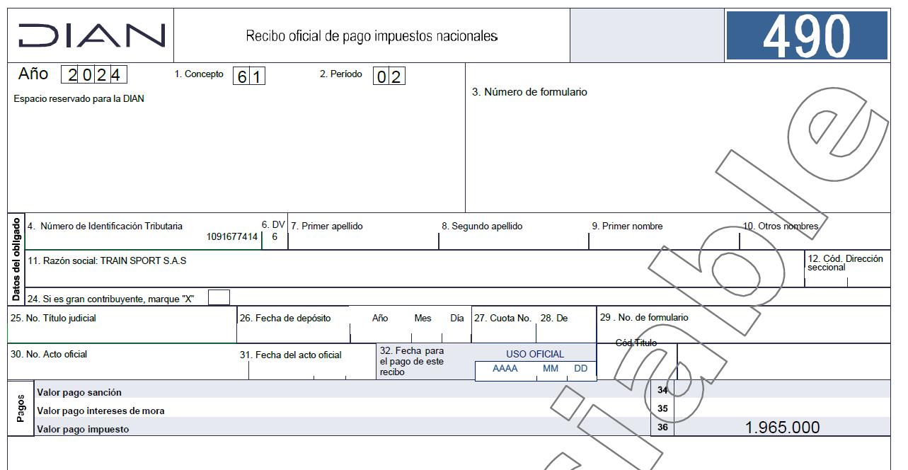 0 2 5.NúmerodeIdentificaciínTributaria(NIT) 6.DV 7.Primerapellido 8.Segundoapellido 9.Primernombre 10.Otrosnombres 1 0 9 1 6 7 7 4 1 4 -6 11.Razónsocial Bimestral Cuatrimestral Siesunacorrecciónindique: 25.Código 26.No.Formularioanterior 27 28 29 30 31 ## 66 32 # 67 8905000 33 ## 68 34 ## 69 35 ## 70 36 ## 71 37 0 ## 72 19678000 38 39 40 41 42 43 44 45 46 47 48 49 50 51 52 53 54 55 56 57 58 59 1 60 2 61 3 981.CódRepresentación FirmaRevisorFiscaloContador.994.ConSalvedades 983.No.TarjetaProfesional 4.Númerodeformularo 12.CodDireccion seccional TRAINSPORTS.A.S DeclaracióndelImpuestosobrelasVentas-IVA Privada 300 1.año 2 4 Datos del declarante Enventacervezadeproducción nacionaloimportada 62 0 Poroperacionesgravadasalatarifageneral A.I.Uporoperacionesgravadas(BaseGravableespecial) 0 Poroperacionesgravadasal5% 0 46871092 0 Deserviciosgravadosalatarifageneral 7000000 Debienesyserviciosexcluidos,exentosynogravados 0 Totalsaldoapagarporesteperíodo(82-84-85+87,siel resultadoesnegativoescriba0) 88 0 0 Porexportaciondebienes Porexportaciondeservicios 0 IVArecuperadoendevolucionesencomprasanuladas, rescindidasoresueltas 0 Totalimpuestogeneradoporoperacionesgravadas