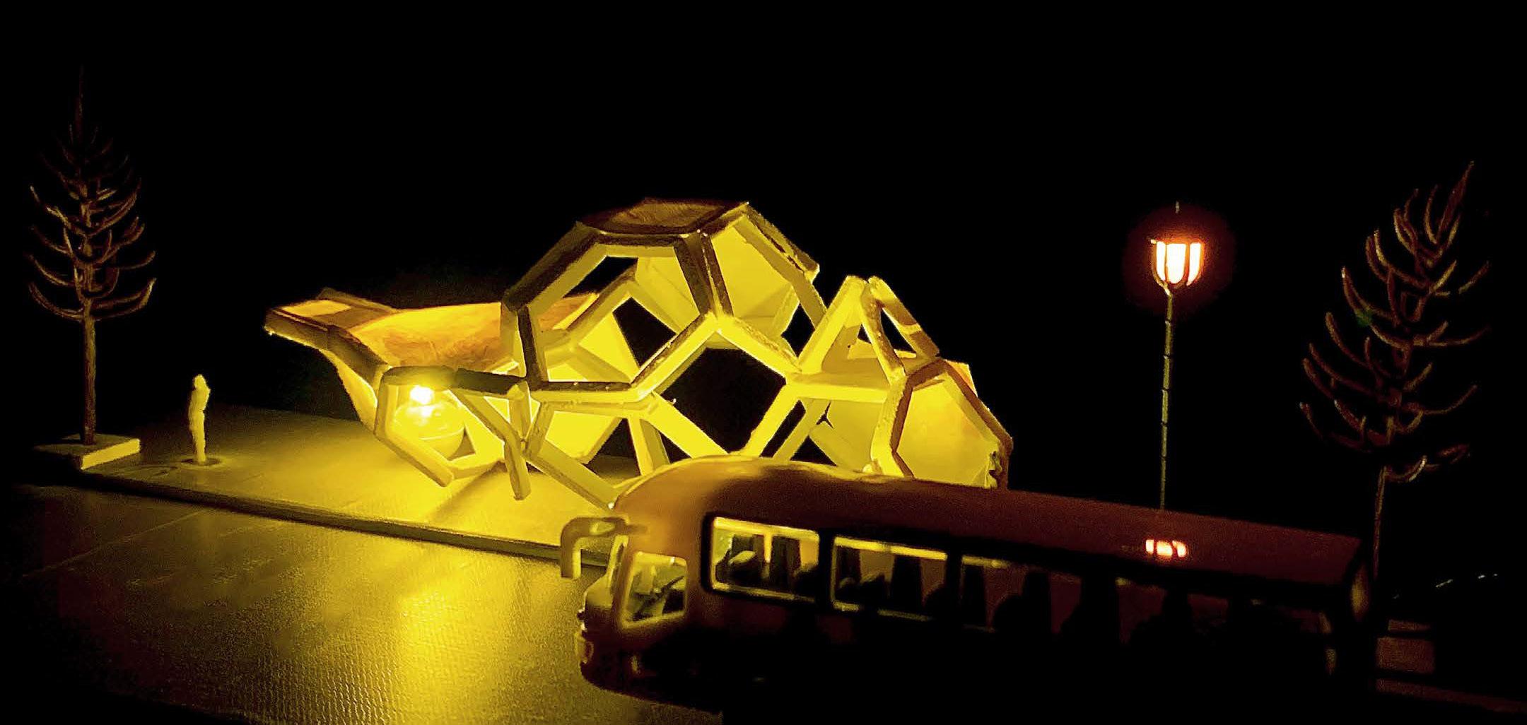 The project aims to provide shelter, seating, and social distancing (to prevent COVID-19) for waiting for passengers on the campus of Georgia Tech. BUZZ, the school mascot, inspires the shape of a beehive/ hexagon. The hexagon develops into an octahedral space and other three-dimensional spaces which connect to it on edge. Each room is segregated from one another.