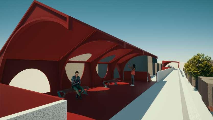 seating station for travellers and view deck for walkers with playing area for kids under