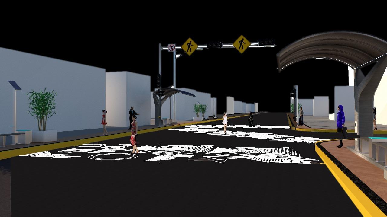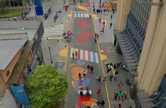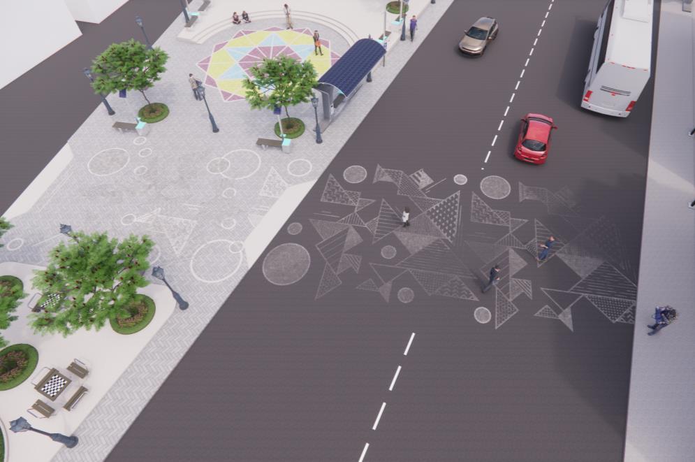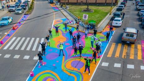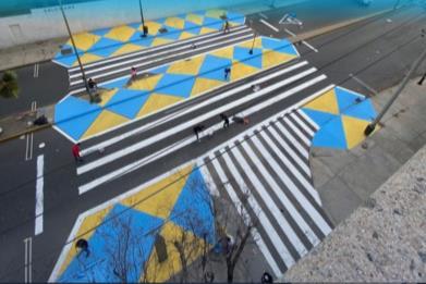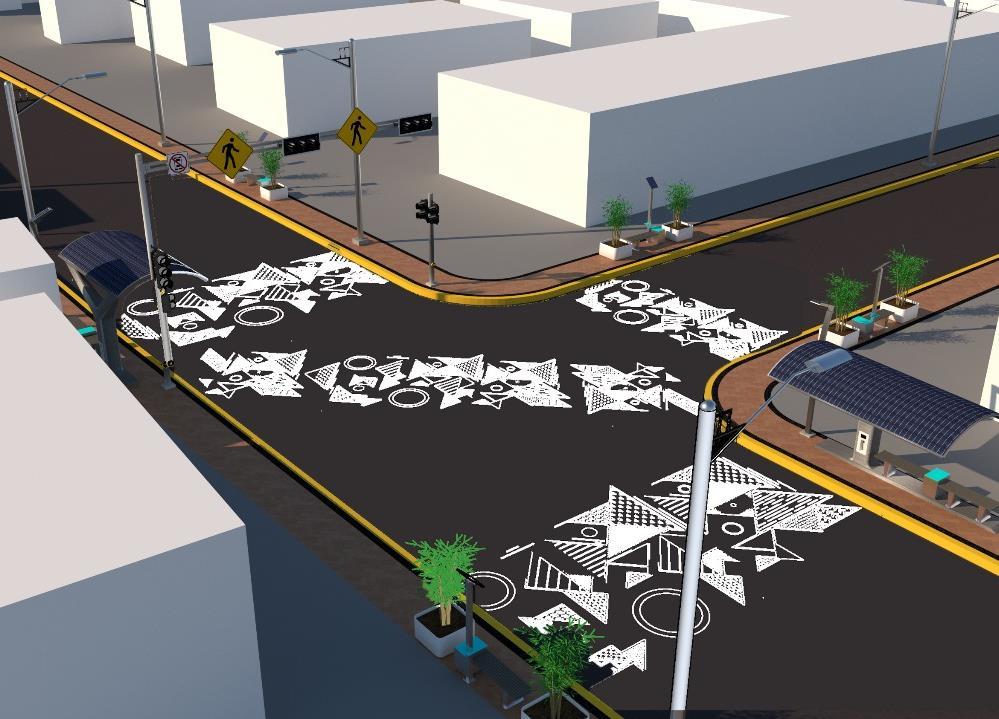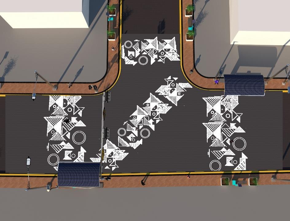 Representación pictográfica que realza y estimula la unión y participación ciudadana a través de diferentes formas y figuras geométricas. Que a su vez trae un fin de señalización vial al representar el paso cebra de estas calles