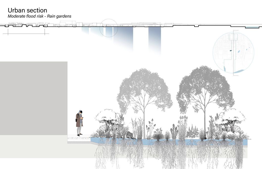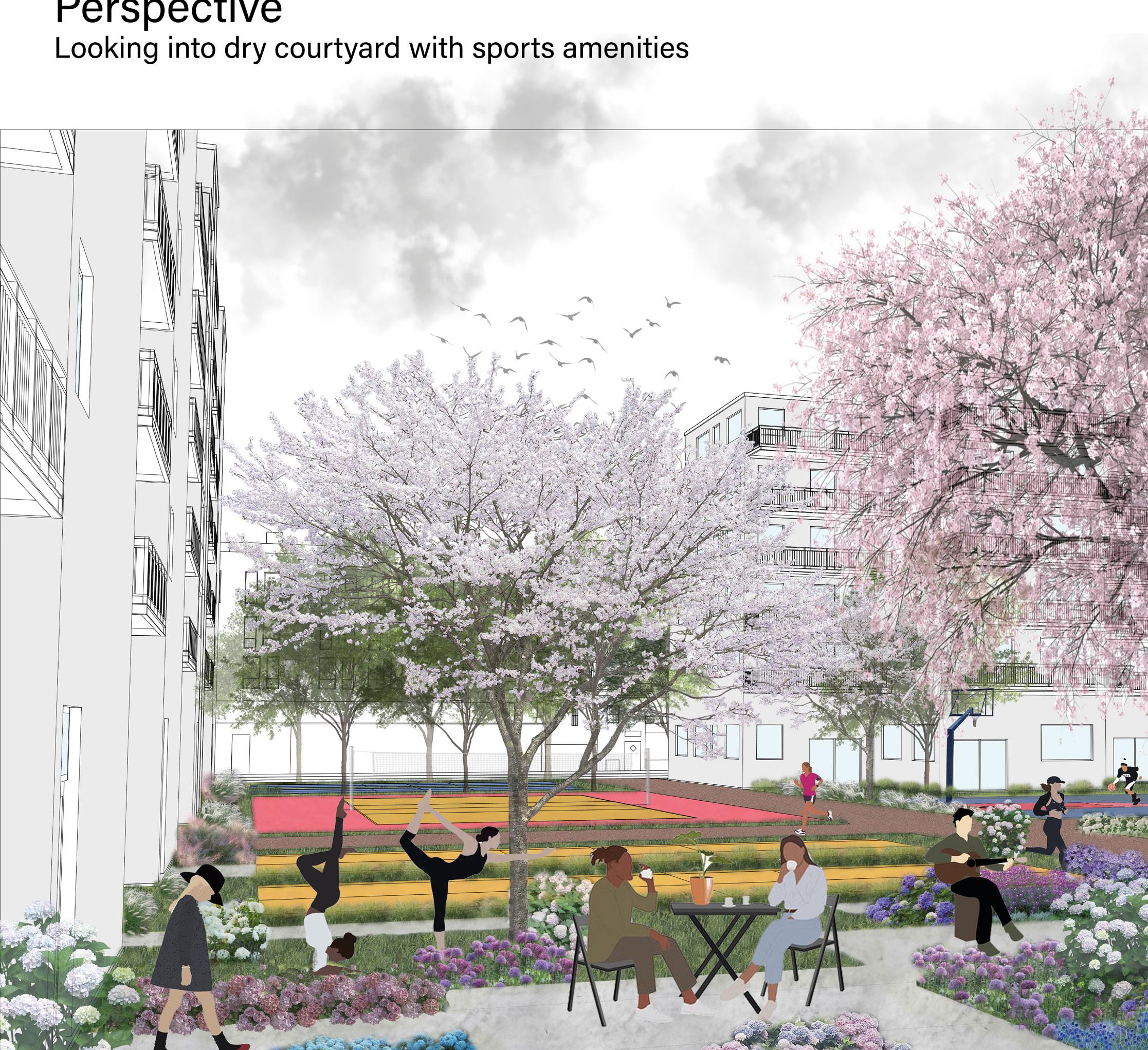 Green lounges and recreational areas serve dual purposes, providing community spaces and aiding flood management.