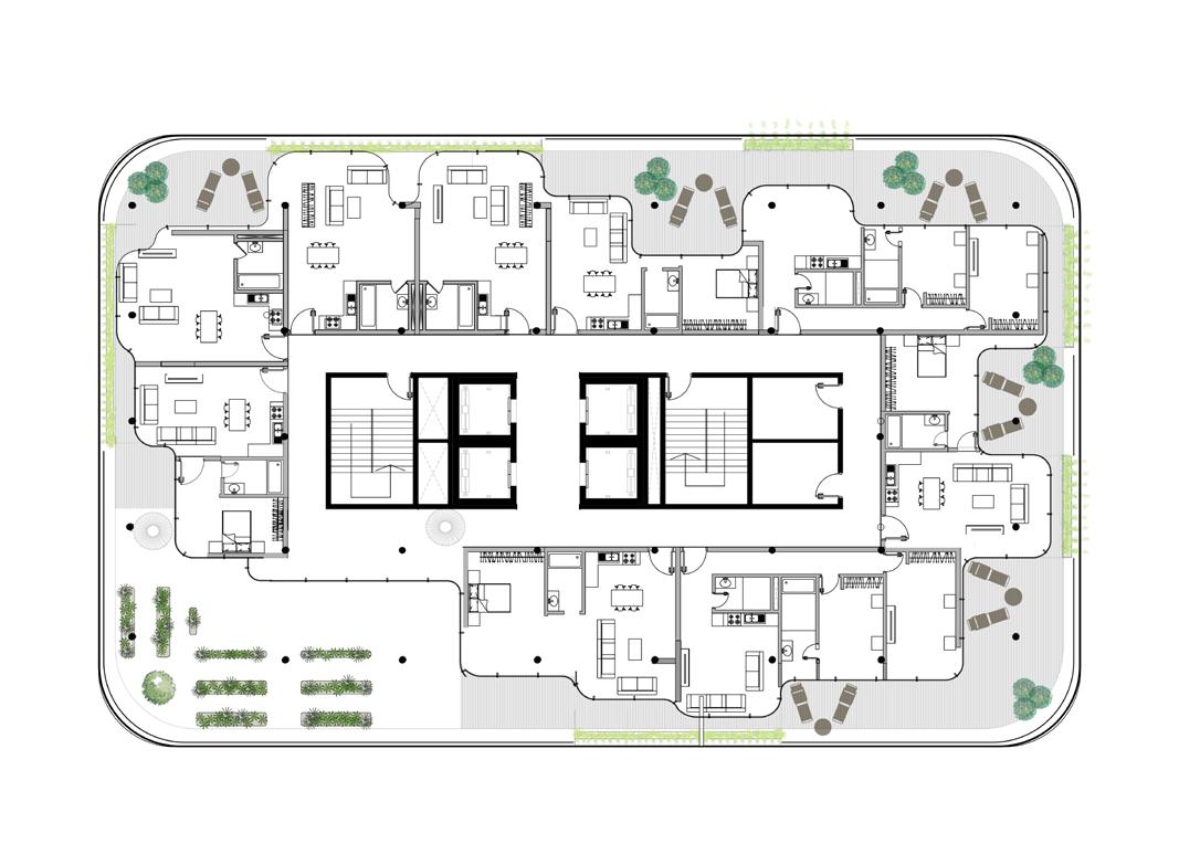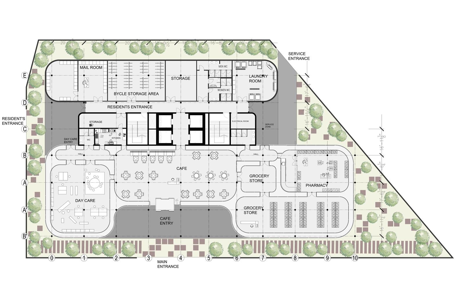 The ground floor program is designed to feature public -facing spaces, including a grocery store, cafe, and pharmacy, situated at the front of the building. Meanwhile, the rear portion of the building is dedicated to resident amenities, offering a range of facilities and services to enhance the living experience.
