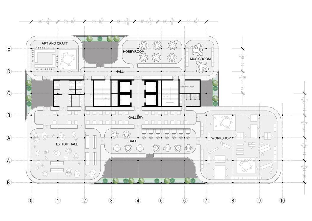 The second floor features semi-public spaces tailored for elderly interests, including art and craft rooms, hobby spaces, and music rooms. The third floor caters to business needs, including a business center, exhibit hall, and conference room, while the fourth floor focuses on recreation with play areas, a fitness center, and yoga rooms.