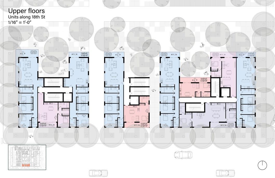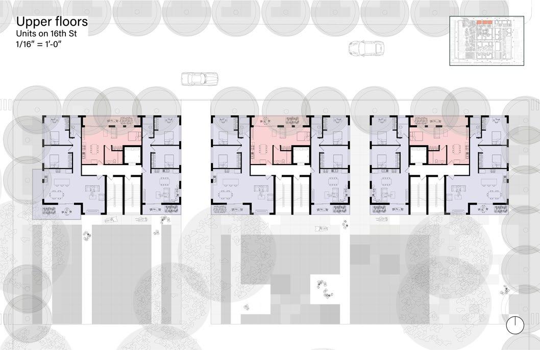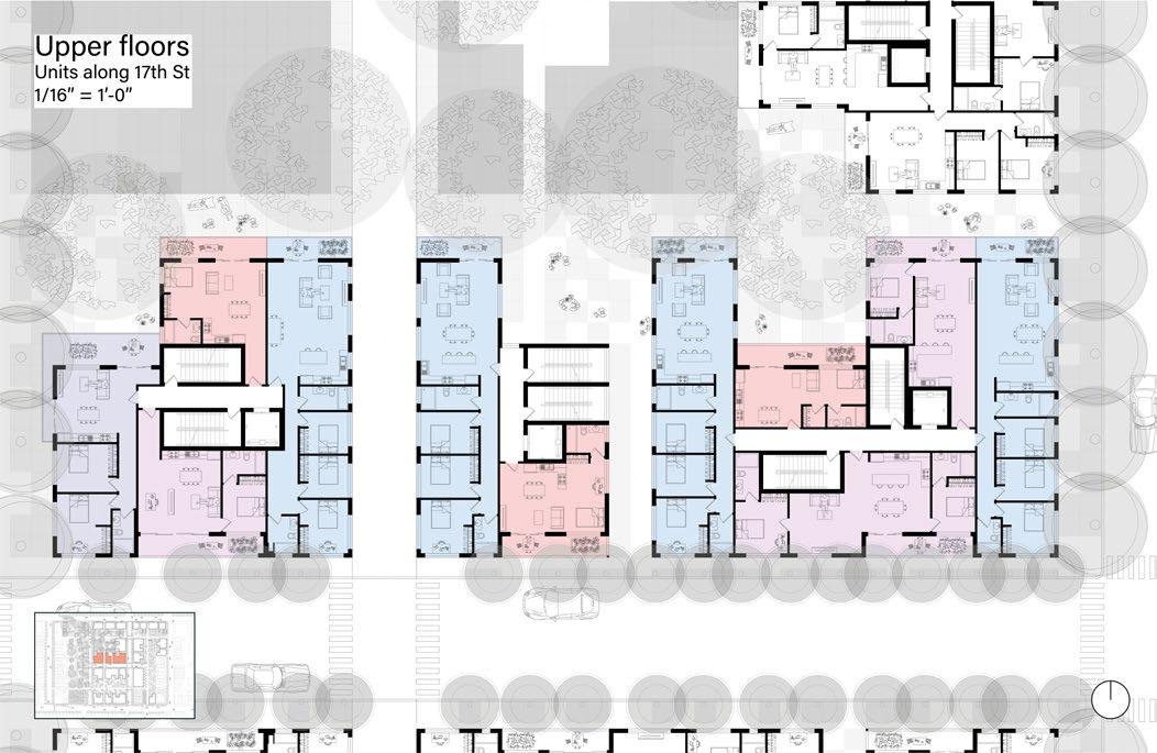 The ground floor program is designed to feature public -facing spaces, including a grocery store, cafe, and pharmacy, situated at the front of the building. Meanwhile, the rear portion of the building is dedicated to resident amenities, offering a range of facilities and services to enhance the living experience.