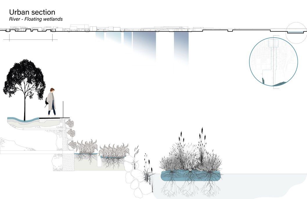 As part of the broader “Wild Mile” reclamation, our project echoes the goals of habitat revitalization, recreational opportunities, and educational outreach. Designed with the organizational principles of swimming centers and aquatic therapy facilities, our emphasis lies in seamlessly integrating water conservation and eco-friendly pool practices.