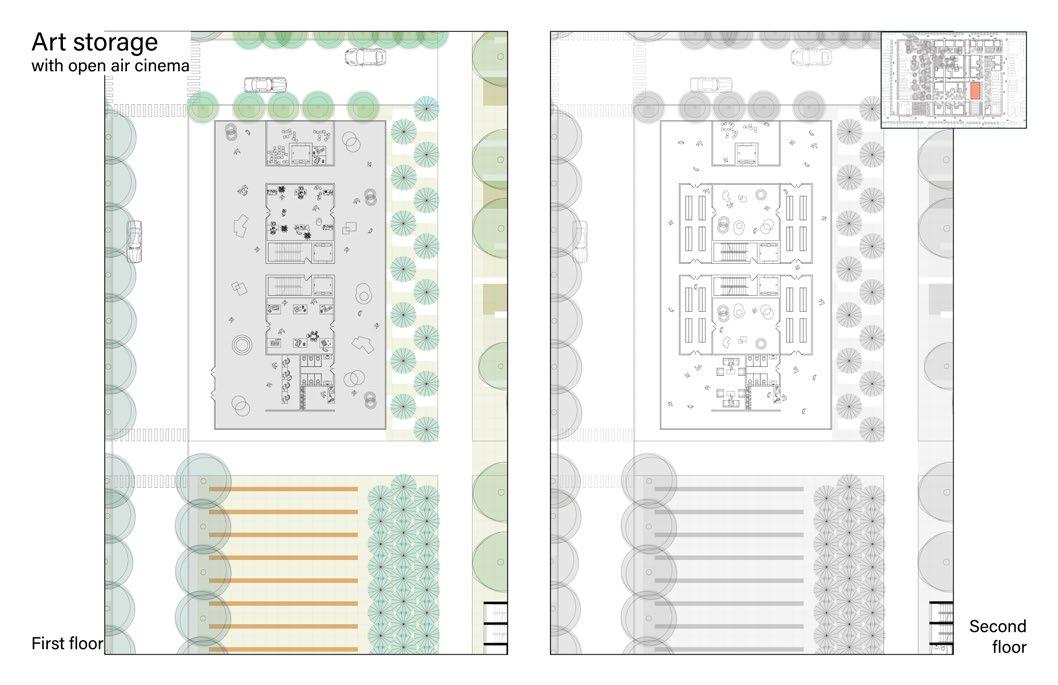The second-floor plan adopts a semi-public approach, featuring dedicated spaces for art and craft, hobby rooms, music rooms, and specialized workshops tailored for elderly residents with diverse interests.