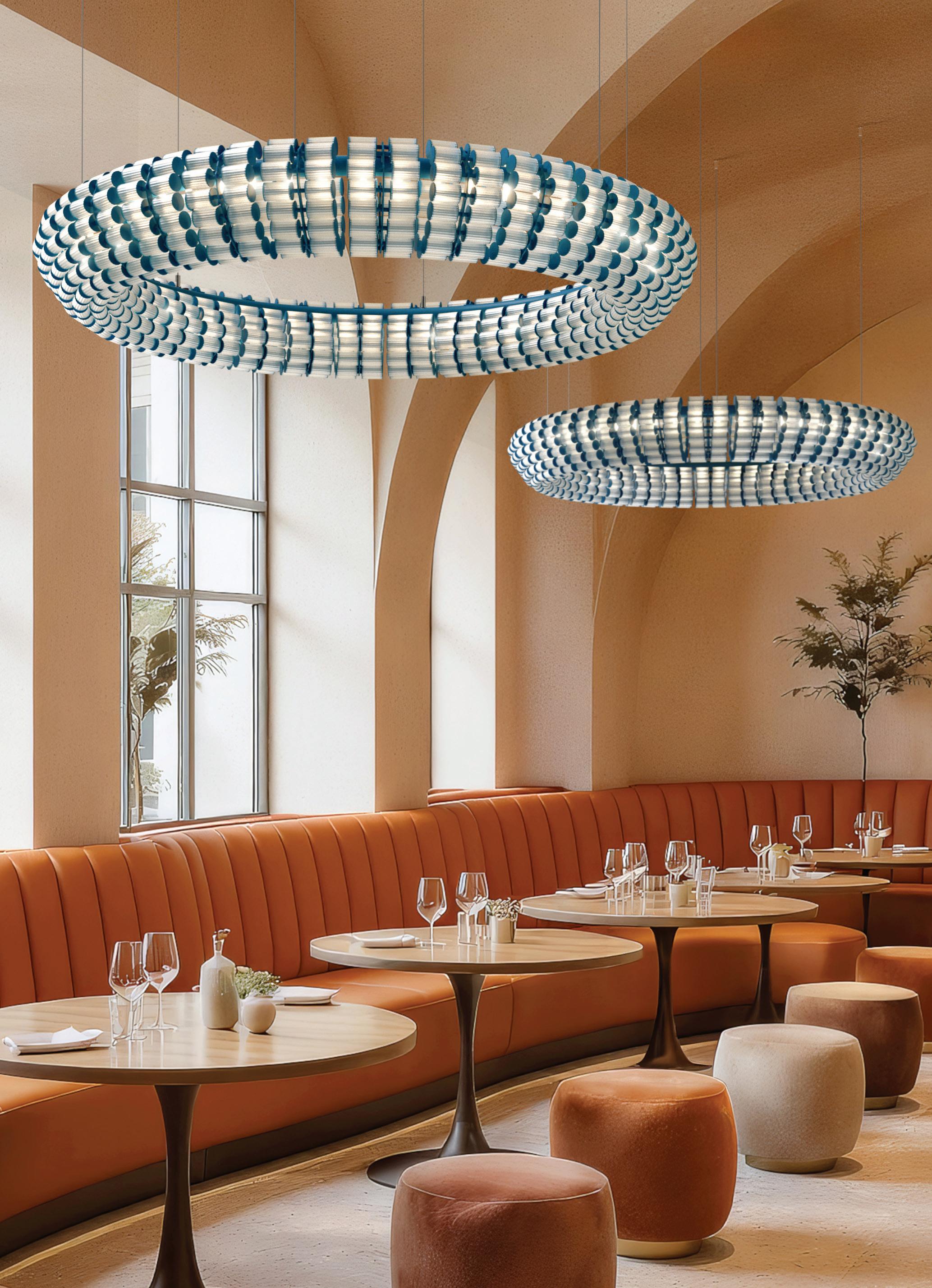 Electric Groove channels the bold, playful energy of Verner Panton’s iconic textile designs, translating curved, rhythmic forms into a luminous sculptural fixture.