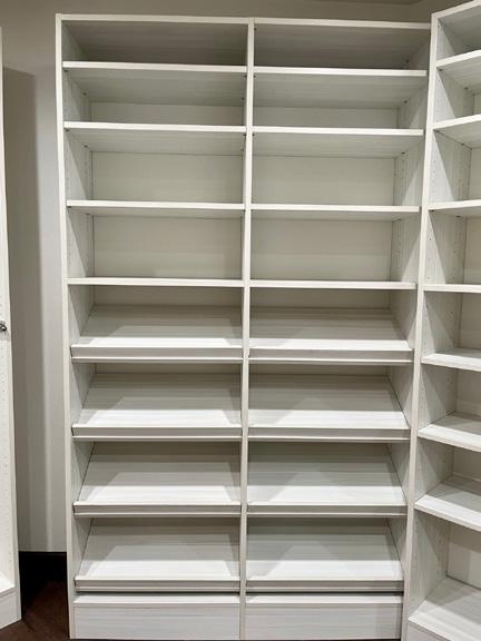 A generous built-in pantry surrounding a black stainless fridge displays the same warm wood cabinetry as the upper cabinets. Located at the far end of the space it sets this hub of the home on a grand scale.