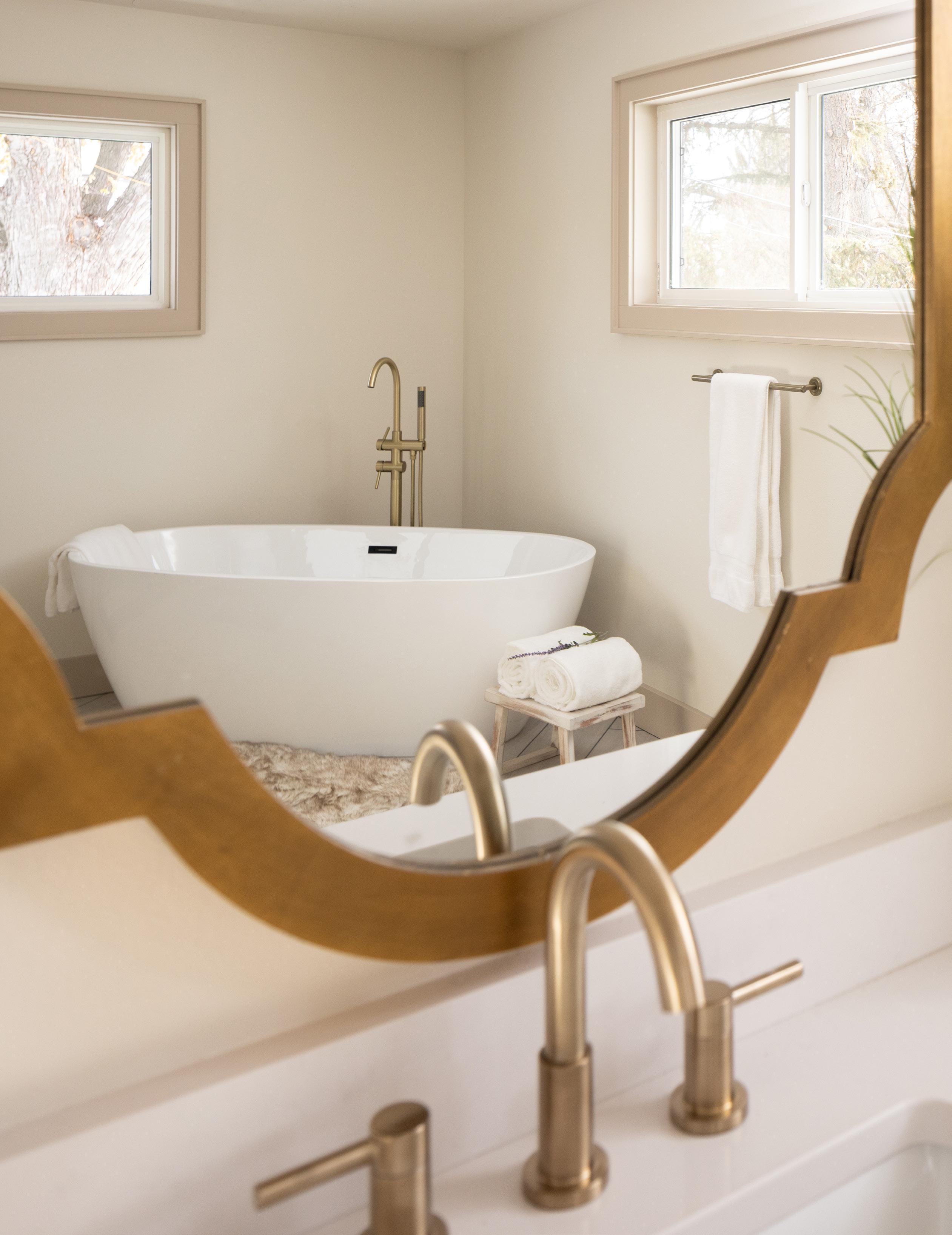 The spa-like ensuite offers a feast for the eyes with dual-color tile flooring. “These wood plank tiles are angled to lead you into the space and immediately bring your eye to the beautiful freestanding tub,” Ragan says. “Just like in the kitchen, the wood brings timelessness and helps tie all the warm tones together.”