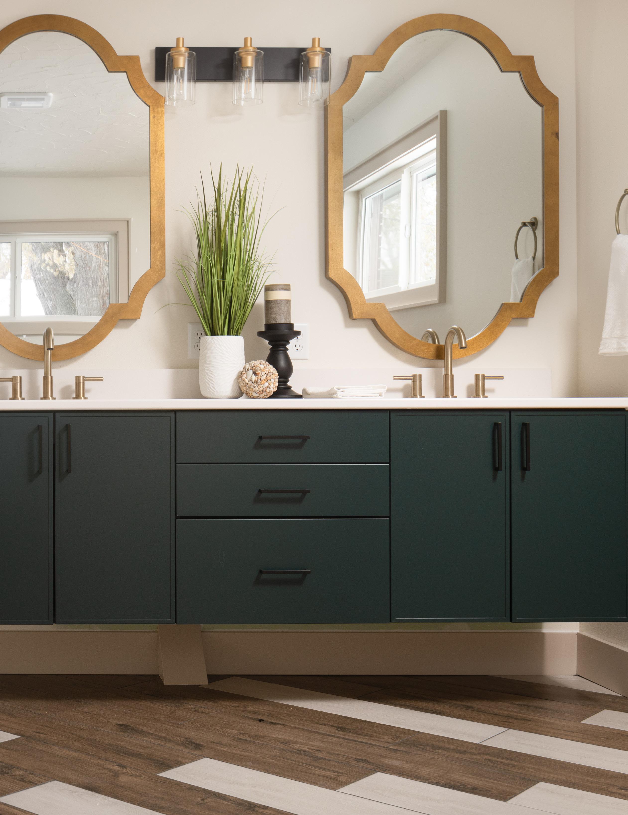 A floating bath vanity dazzles in a muted green hue presenting a “pop of color,” says Kendra. Grandiose gilded-frame mirrors above the vanity’s sinks enhance the elegance.