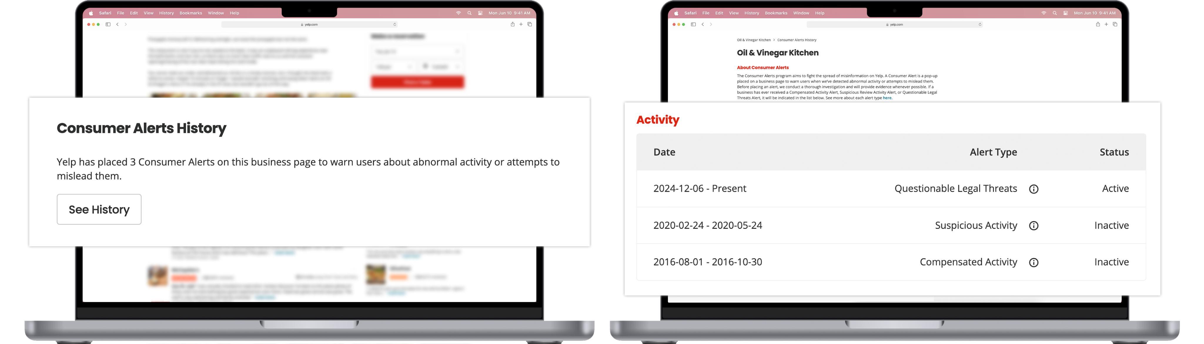 A found that 91% of review readers want to know if a business has been the subject of suspicious review activity. In 2023, Yelp started publicly indexing the and Compensated and Suspicious Review Activity Alerts on our . Now, users can find a Consumer Alerts History section on impacted Yelp business pages, which details any previous , , or placed on the page. This new Consumer Alerts History section offers another way for people to learn about abnormal review activity or other misleading attempts identified by Yelp, and is viewable on desktop on business pages that have been the subject of prior Consumer Alerts via a link below the business’s recommended reviews.