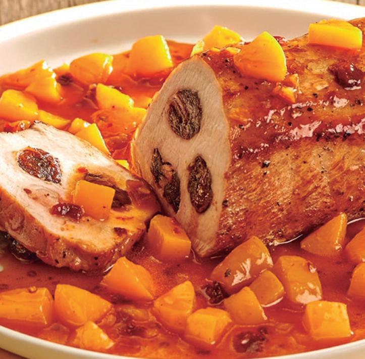 -Con relleno de ciruela, tocino, pasas, nuez y hierbas finas