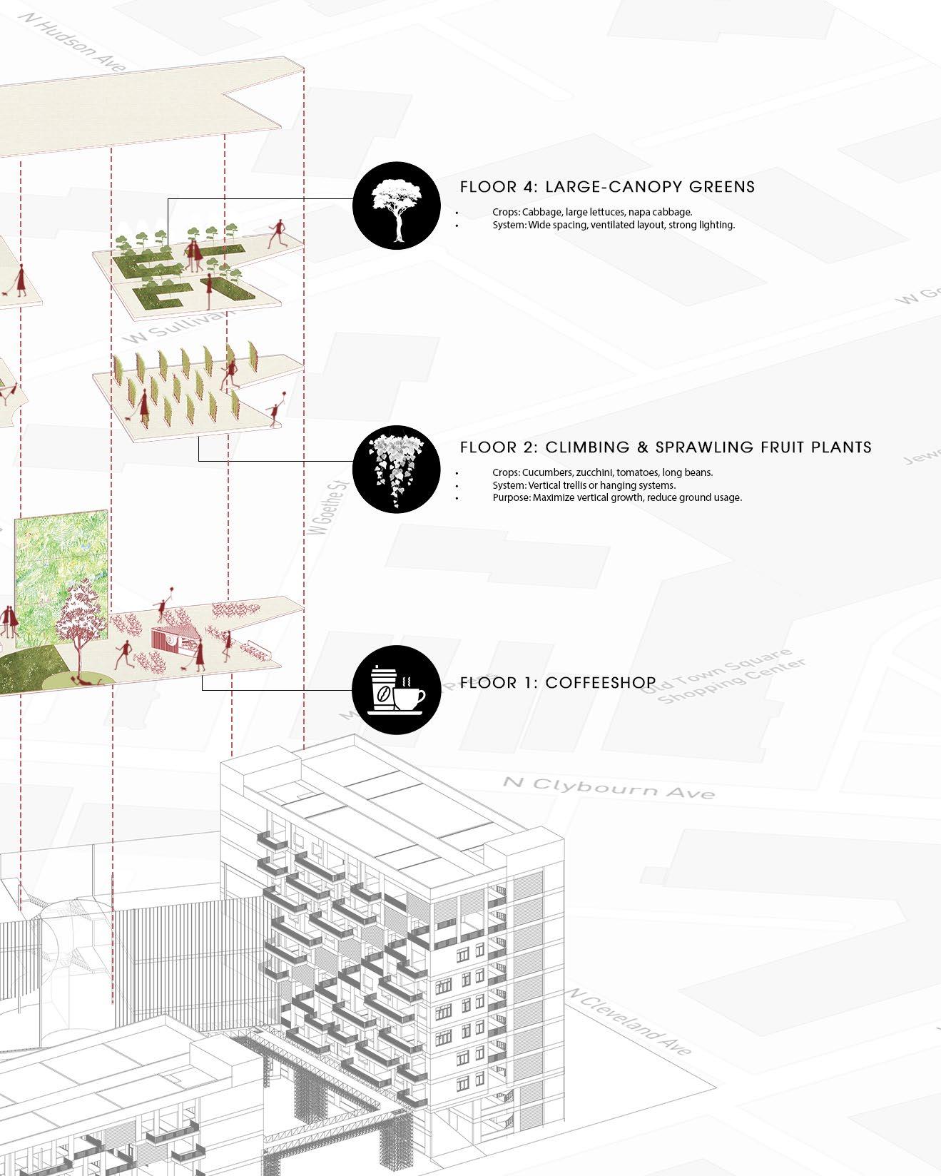 Rooftop gardens, urban farming plots, and community greenhouses are positioned at the uppermost levels and open plazas, acting as civic anchors that support community gathering, food production, and environmental education.