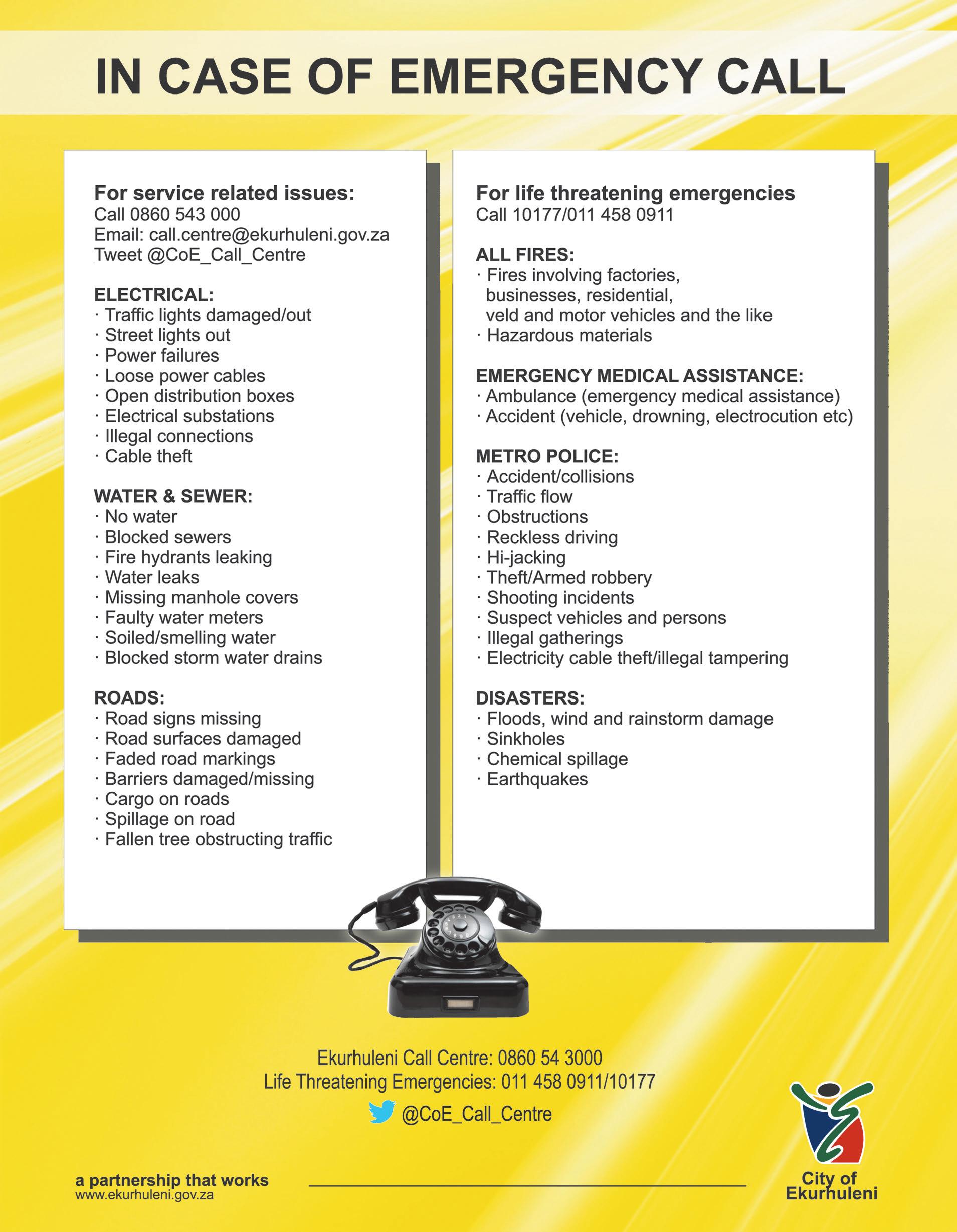 CITY OF JOHANNESBURG: Metropolitan Municipality Ambulance: Enquiries & Emergency (For All Life Threatening Emergencies) Emergency Connect 011 375 5911 Emergency Connect 1 0177 Joburg Connect 086 056 2874