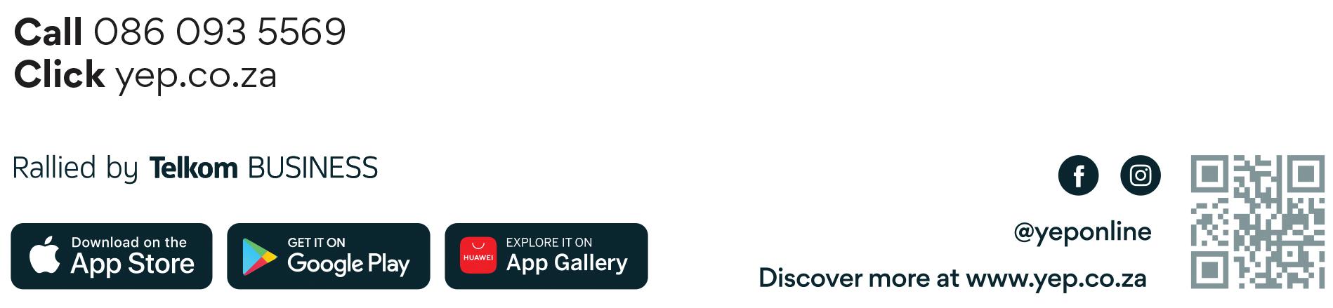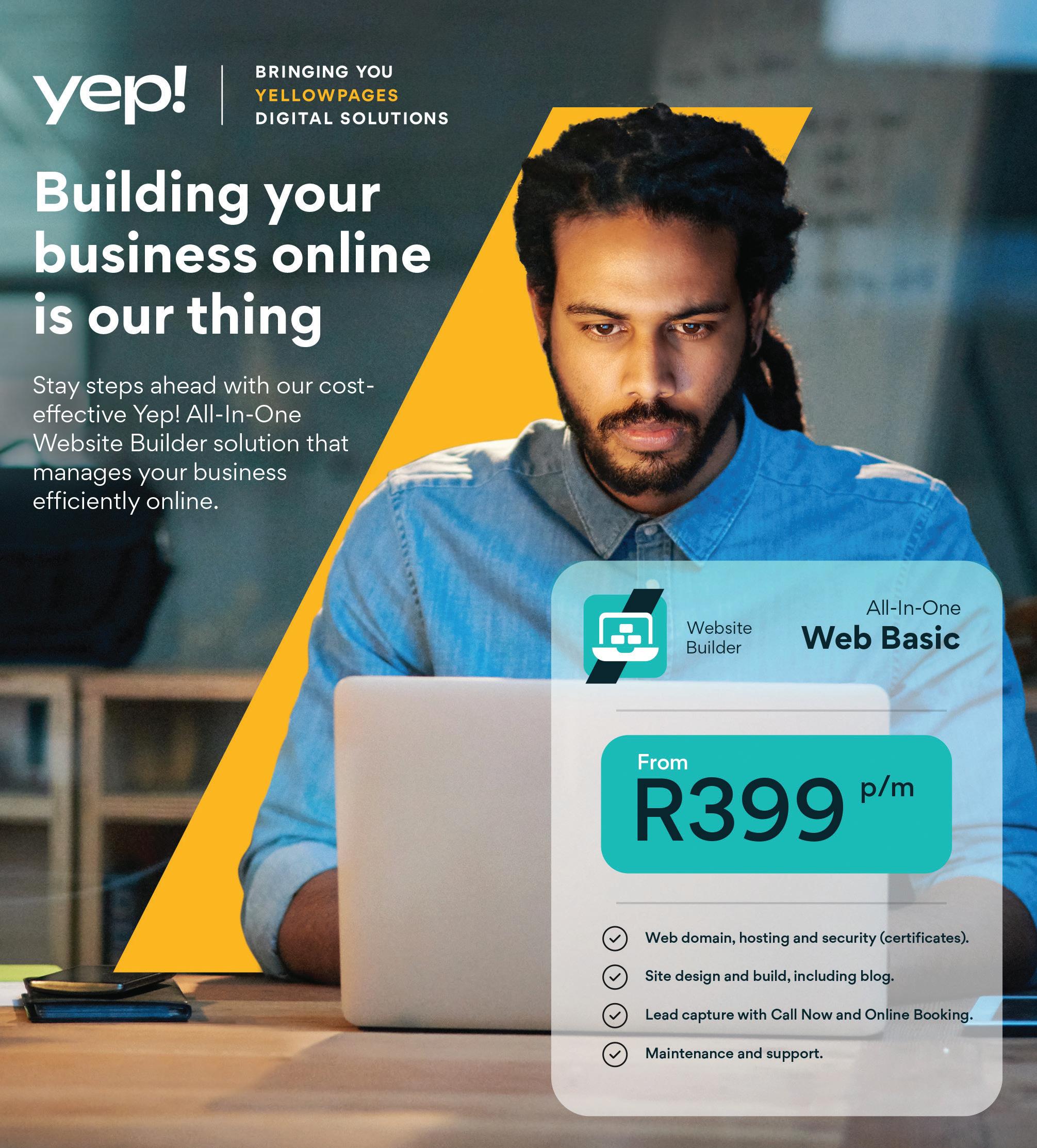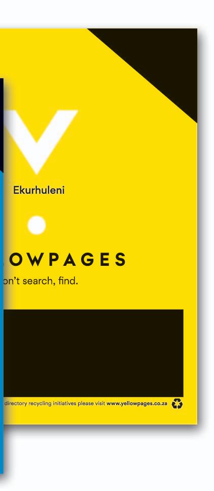 0860 YELLOW (0860 999 0589) | www.yep.co.za WATCH THIS SPACE For a FREE listing, contact Sales on e-mail: jabulile.nyembe@yp.co.za The Yellow Pages is embracing the digital era, trading ink for pixels as we transition from printed directories to nationwide online eBooks.