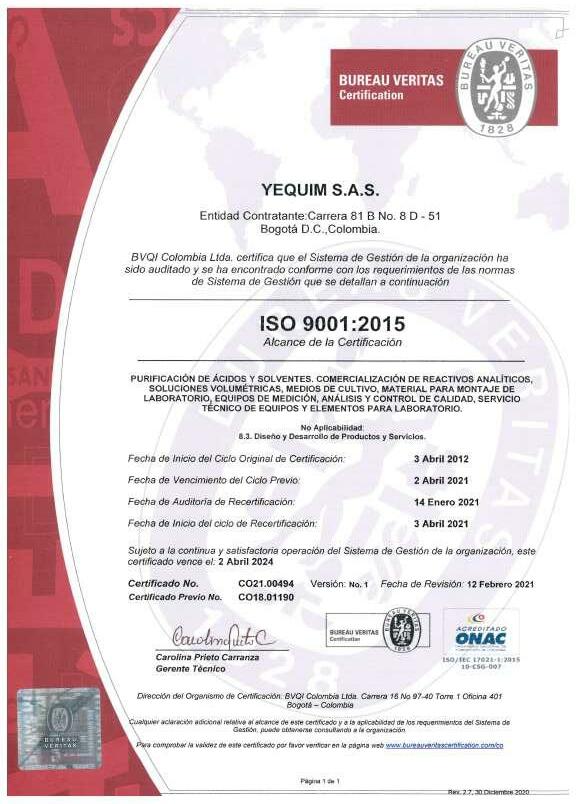 ISO/IECACREDITADO17021:200610/CSG-007N CO235111 YequimR REACTIVOS ANÁLITICOS www .y e q u im. c om. c o