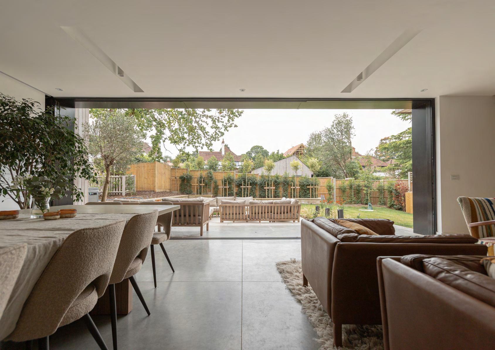 This contemporary home in Sevenoaks is an example of modern living with its seamless integration of indoor and outdoor spaces. A defining feature of this project is the expansive set of YES Vision pocket sliding doors that connect the open-plan living area to the patio and garden. When fully open, these doors disappear into the wall cavity, creating a truly uninterrupted flow and extending the living space outwards.