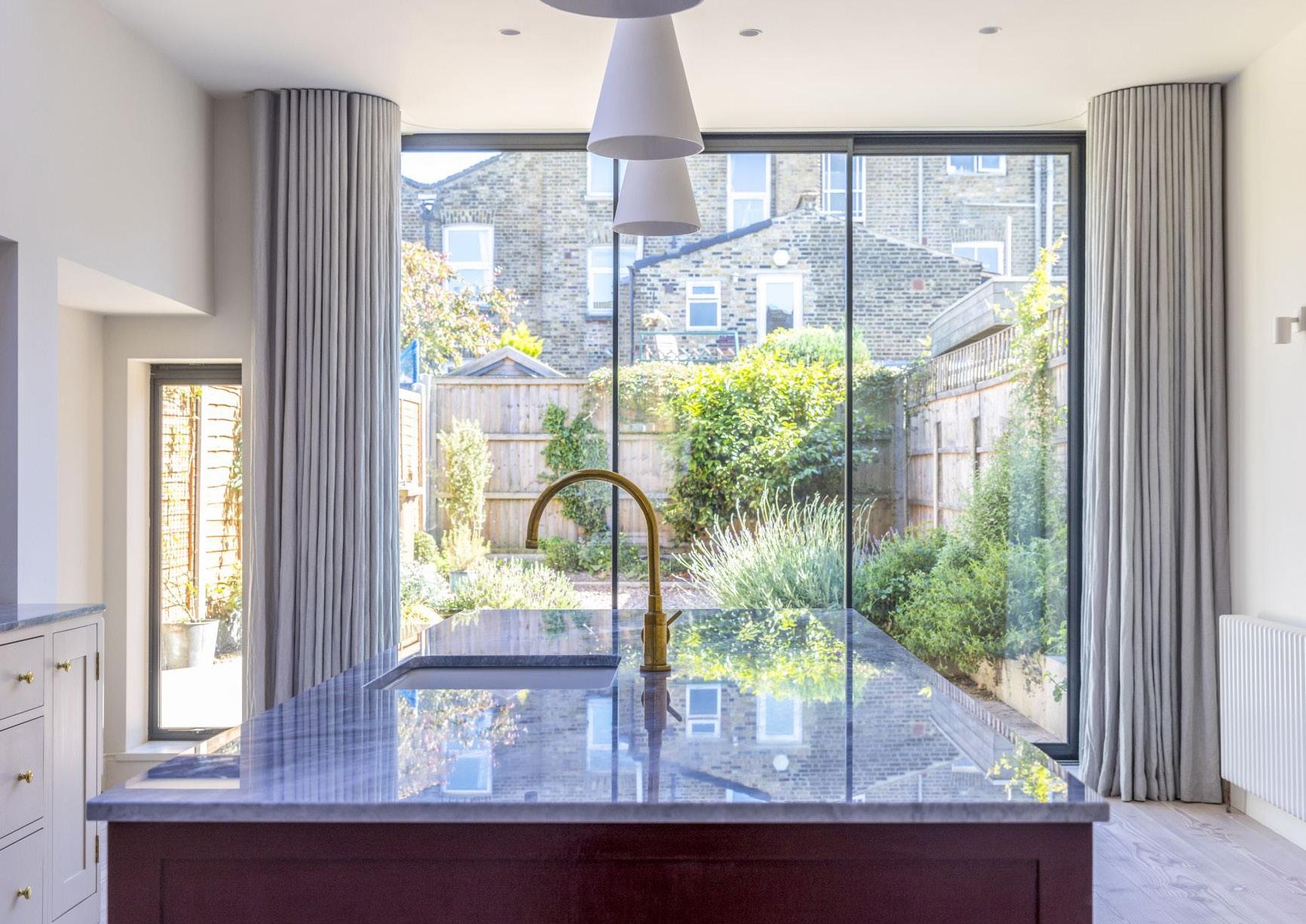 The inner panel of the double-glazed unit is back-painted, providing a perfect visual finish on the outside. Internally, the glass-to-glass joint creates an illusion from specific angles inside, which makes the 90-degree corner joint virtually disappear, allowing for an uninterrupted view of the outdoor garden space.