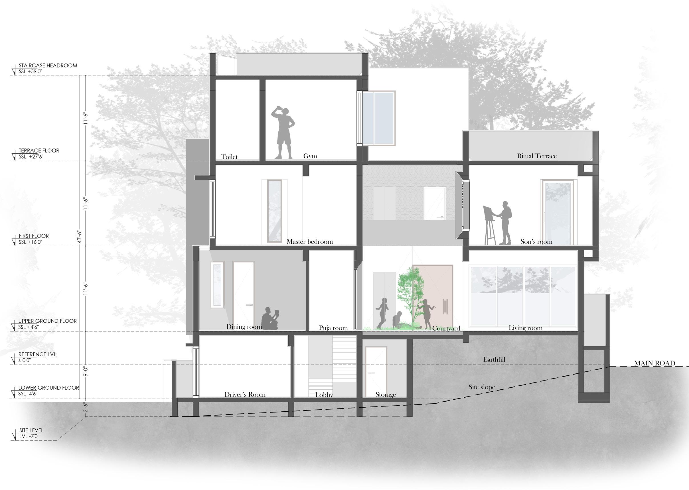 Located within a developing residential district, this residential plot corners at south-east and experiences moderate contours. With client belonging to a traditional brahmin community wanted to have few physical, spiritual and intellectual spaces as part of his brief namely, courtyards, reading area, gym and a ritual terrace. Hence, the design idea evolved by aligning spaces around the central courtyard.